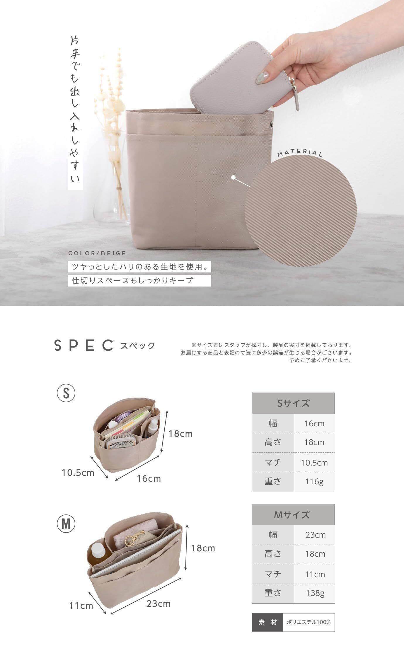 バッグインバッグ 小さめ インナーバッグ 縦型 【バックの中を簡単に整理整頓可能】 (ベージユ, Sサイズ)