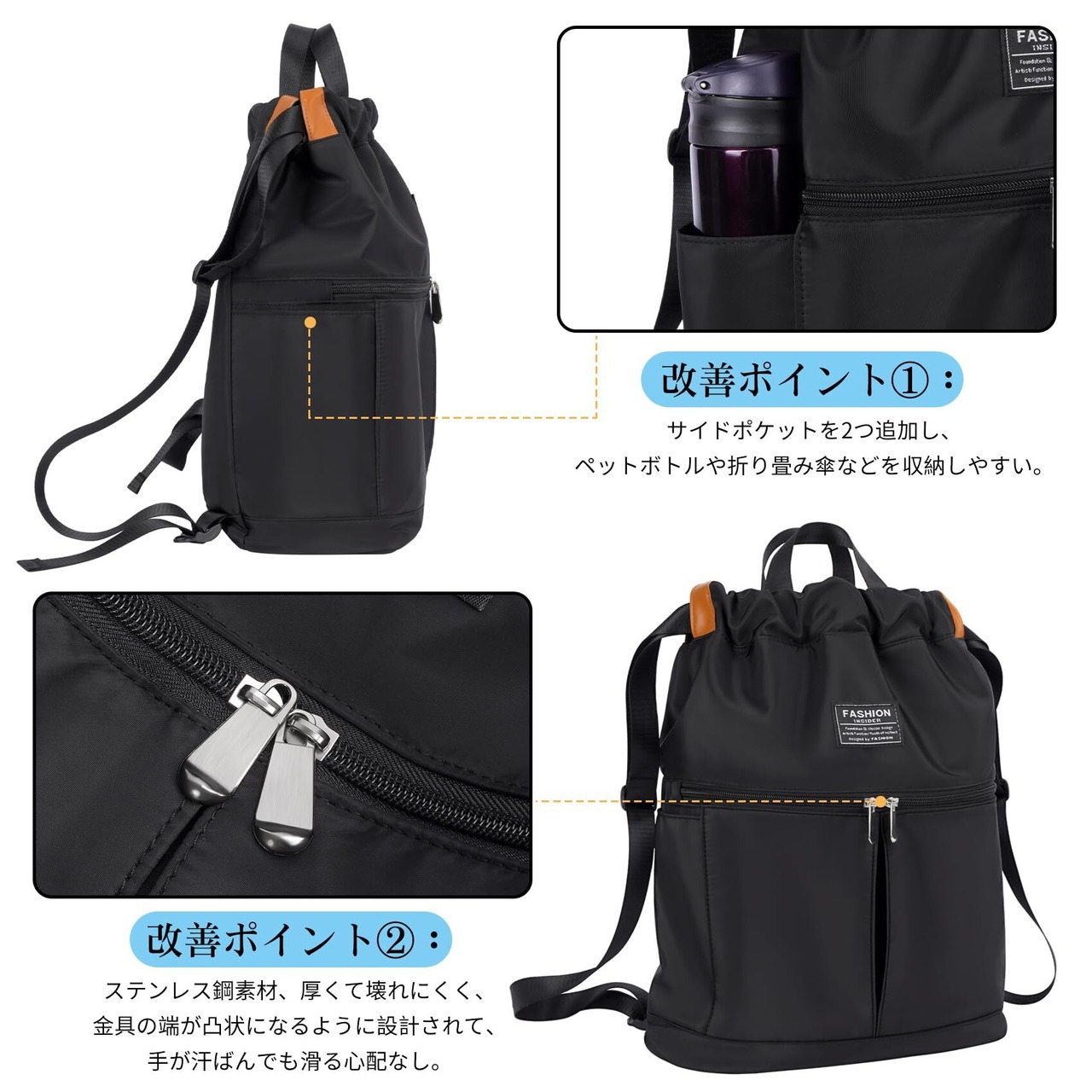 【改善ポイント】厚手のナイロン素材で作られたナップサック。サイドポケットを2つ追加し、ペットボトルや折り畳み傘などを収納しやすい。前ポケットのダブルジッパー、ステンレス鋼素材、厚くて壊れにくく、金具の端が凸状になるように設計されて、手が汗ばんでも滑る心配なし。