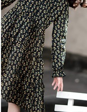 ベージュとブラックの2色展開、清楚な小花柄があちこち散りばめて、袖口のフリルデザインはとても可愛くて、エレガントで女の子らしさのあるスタイルに仕上げます。