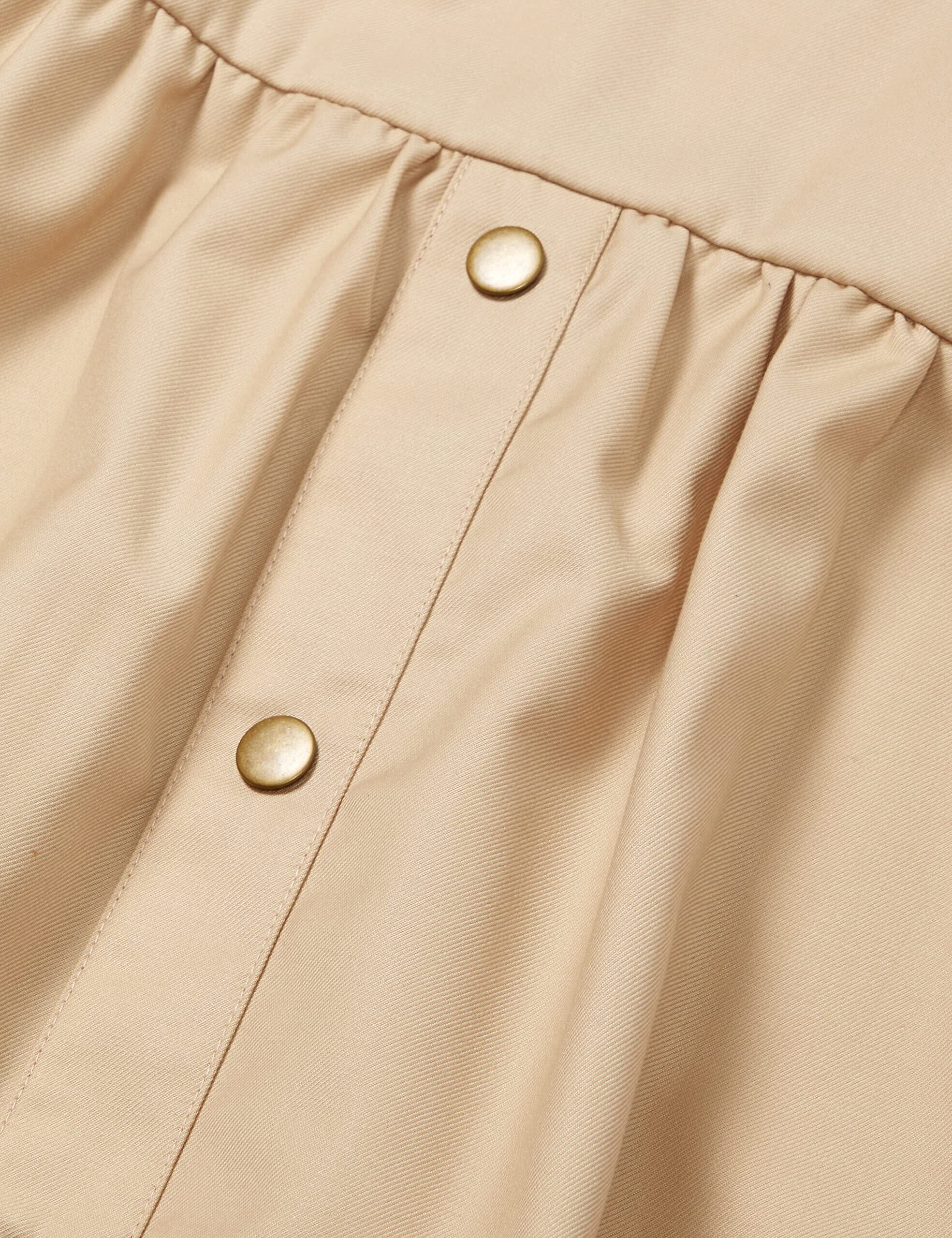 デザイン・シルエット : Tシャツにベアトップワンピースを重ねたような、ドッキングデザインワンピース。布帛切り替えは、トップの後ろ側をギャザー使いにしています。スカートラインのボタンディテールがデザインアクセント。