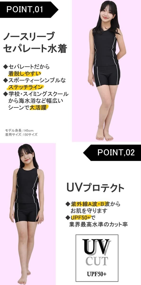 【スタイル】 意外に捜すと中々見つからない 黒 ブラック カラーベースの、セパレート ツーピース タンクトップ タンキニ 水着。ステッチカラーがシンプル スタイリッシュ。 カップ付き UPF50+ UVケア 紫外線カット素材で安心。小学校、中学生、高校生 と幅広いサイズ展開で、学校、スイミングスクール、海水浴、川遊び、キャンプなどに大活躍。お肌に有害な紫外線を98%以上カット!糸からなので洗濯を繰り返しても大丈夫です。