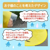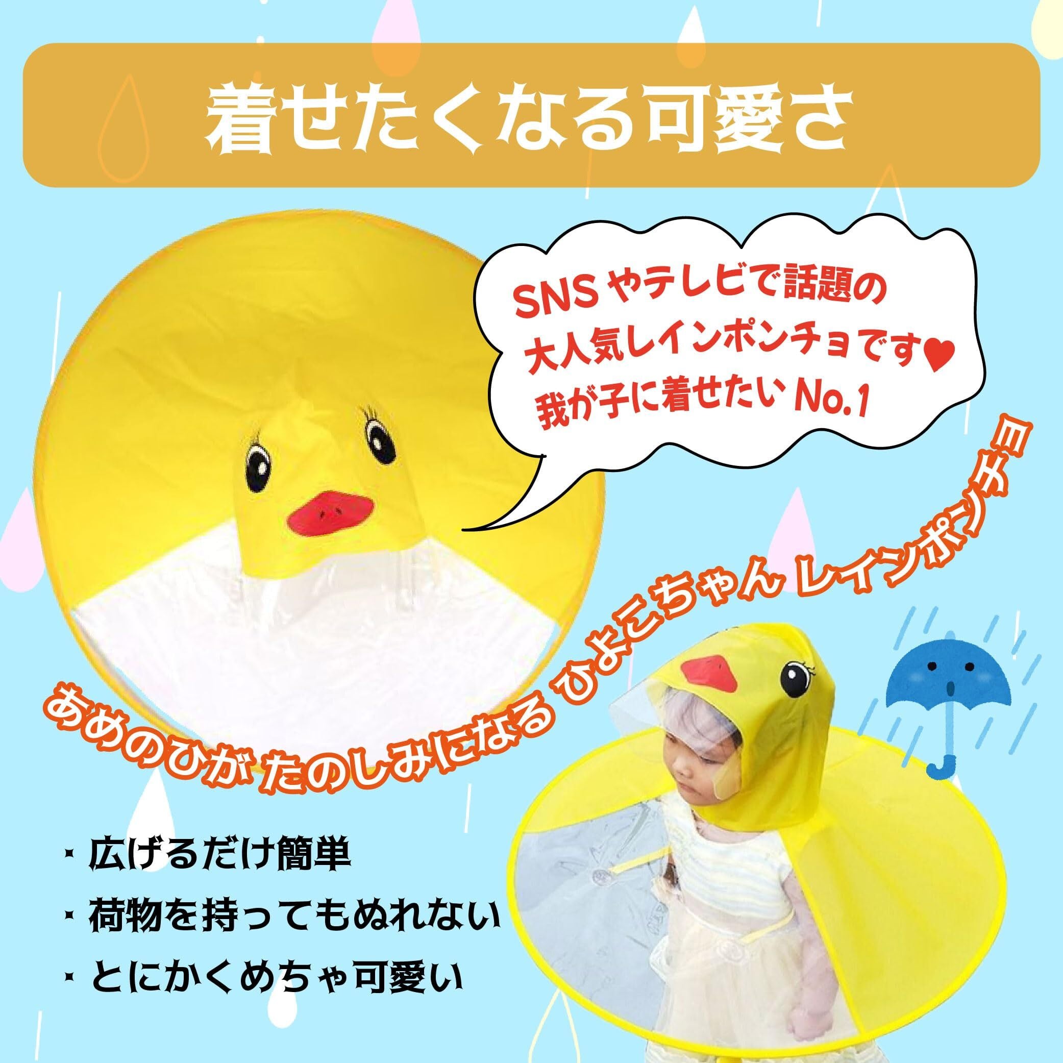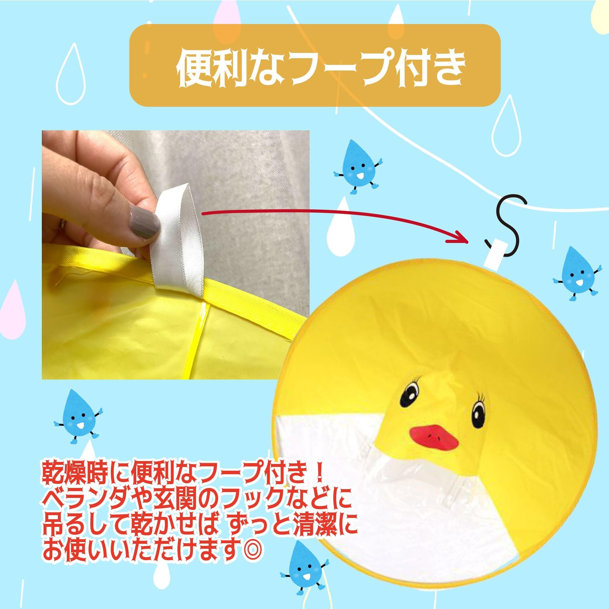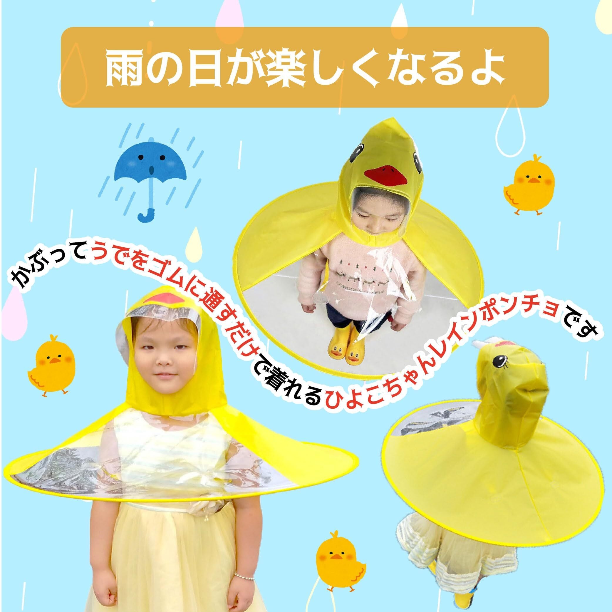 【おすすめポイント】Instagramやテレビで紹介された、今人気のひよこちゃんレインポンチョです 雨の日が楽しみになっちゃう。 可愛いひよこちゃんデザインのレインポンチョです。 なんといっても可愛すぎるので サイズが合う間に一度着せてみてください。 レインコートや傘が嫌いなお子様 雨が憂鬱なお子様、荷物が多いお子様に おすすめです。 開いてかぶるだけ。 使った後はフックにかけて干すだけ。 折りたためばコンパクトになるので バッグに入れておいたり、収納も楽です。 吹き飛び防止に両腕が通せるゴム付き。 フードの先端は前を見渡すことができるよう 透明の素材で作られております。