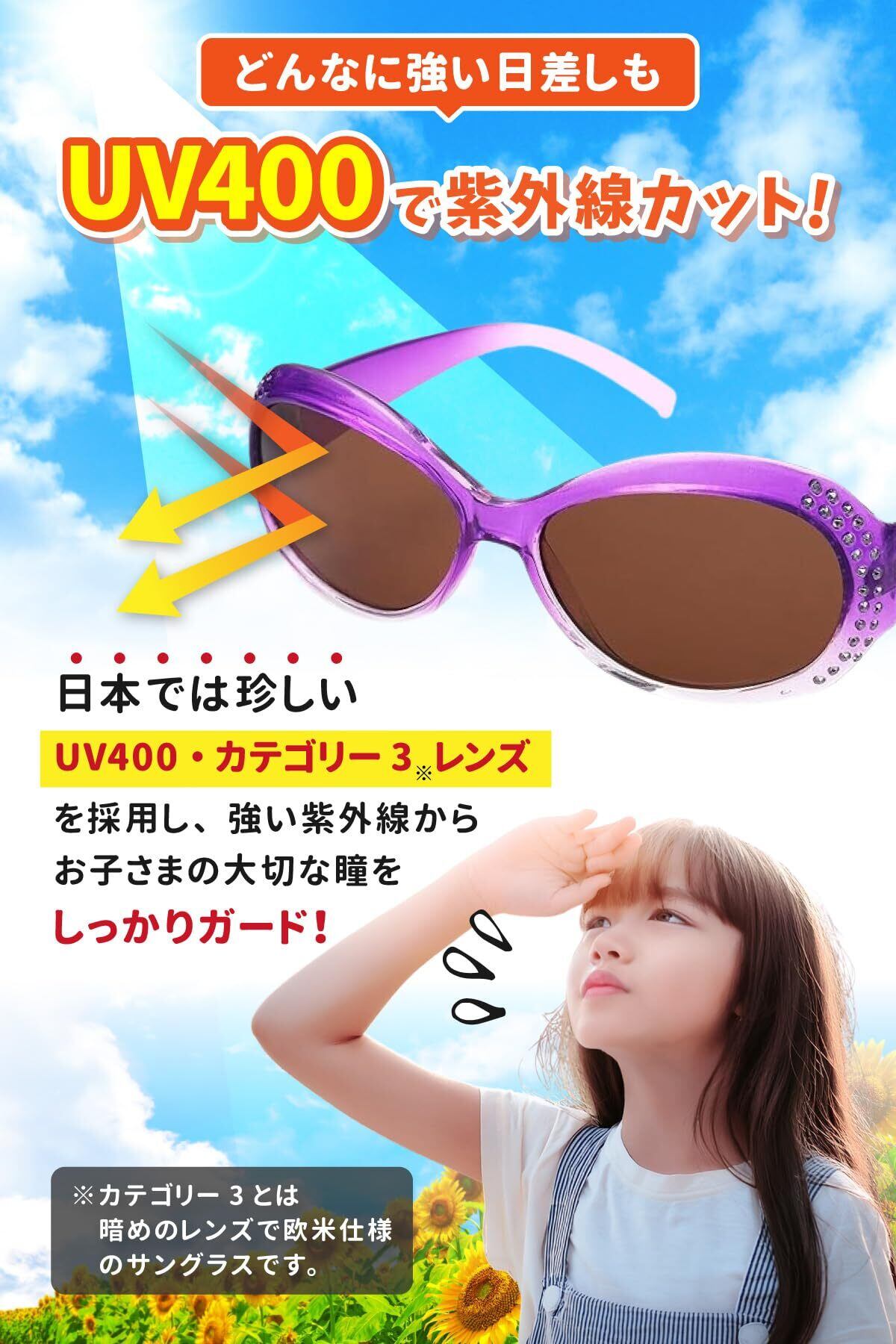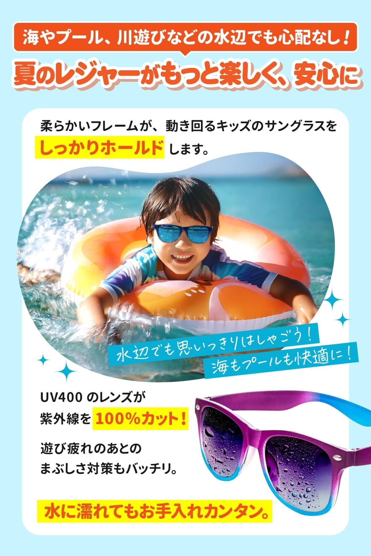 このサングラスは、優れたUV400保護機能を備えており、お子様の大切な目を有害な紫外線から守ります。日差しの強い夏の日でも安心してお子様が外で遊ぶことができます。お出かけには欠かせないアイテムです。