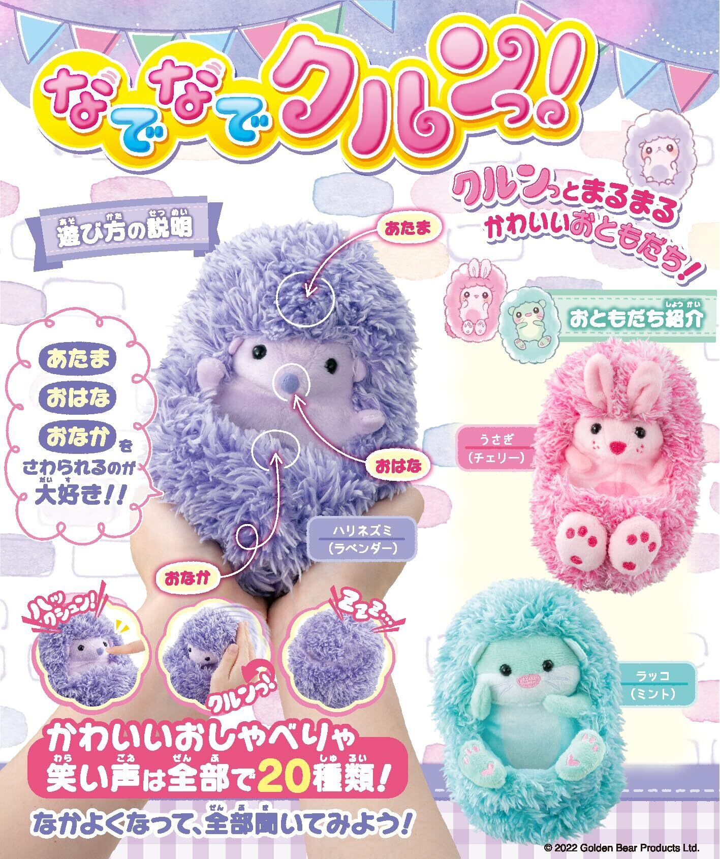 ハリネズミ(パープル)、うさぎ(チェリー)、ラッコ(ミント)の3匹のお友達がいるよ!