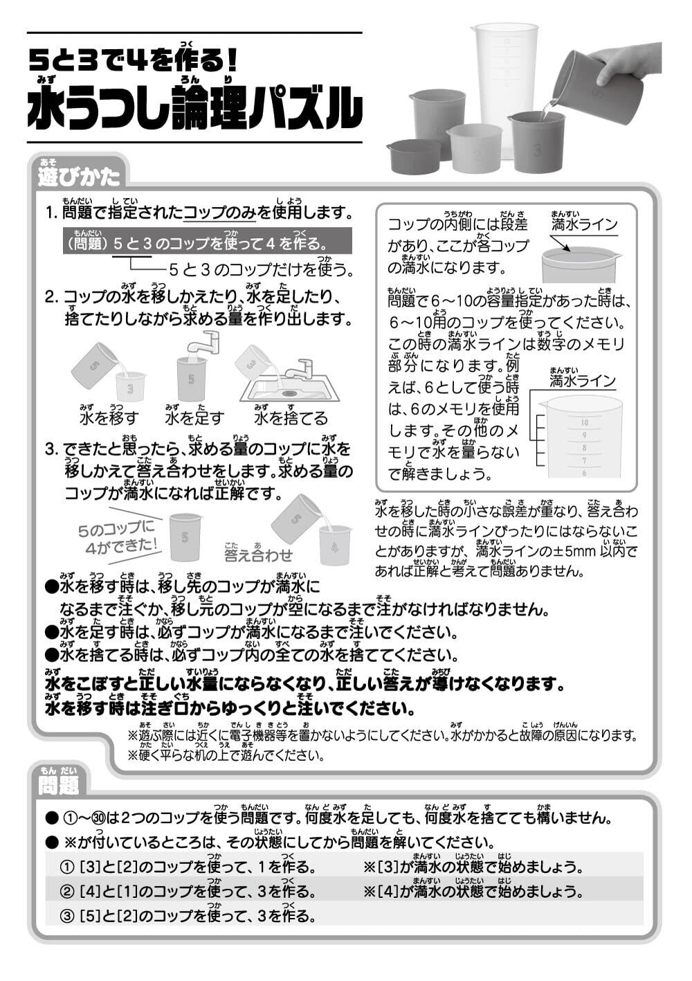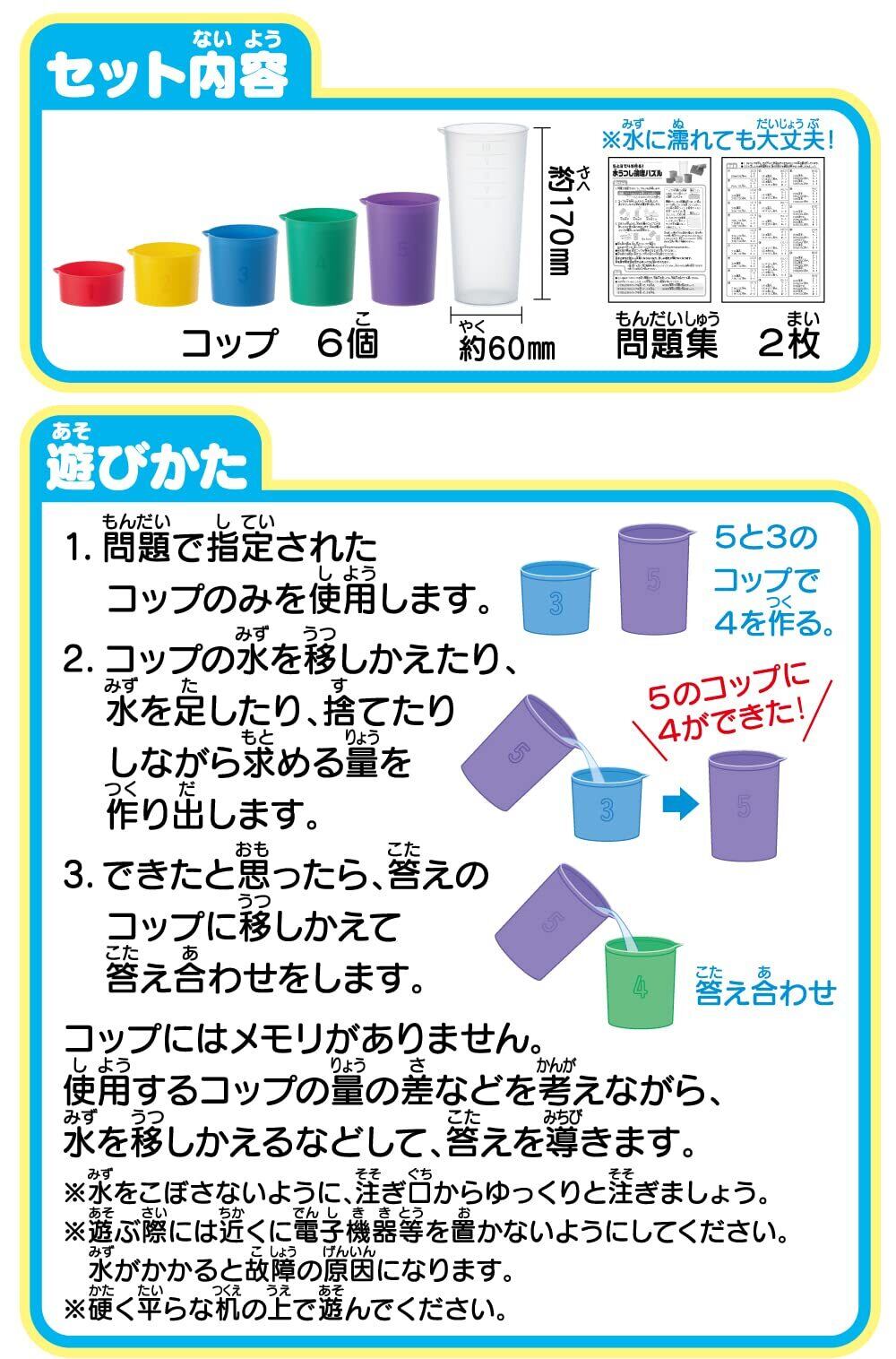 「容量5のコップと容量3のコップだけを使って、水を移しかえて容量4を作る」こんな算数の問題を実際にコップを使って解くことができる商品です。紙面上や頭の中で解くには難しい問題も、実際に手を動かして解くことで意欲的に楽しみながら解き進めることができます。解く過程で『水を移しかえたら、コップの水量はいくつになり、そこからさらに移すといくつになる』といったように思考を積み重ねながら解いていくことによって論理的思考力や数学的思考力を養います。コップは1、2、3、4、5の各コップと6~10が量れるコップがあります。40問の問題が掲載され、濡れても大丈夫な問題集も入っています。