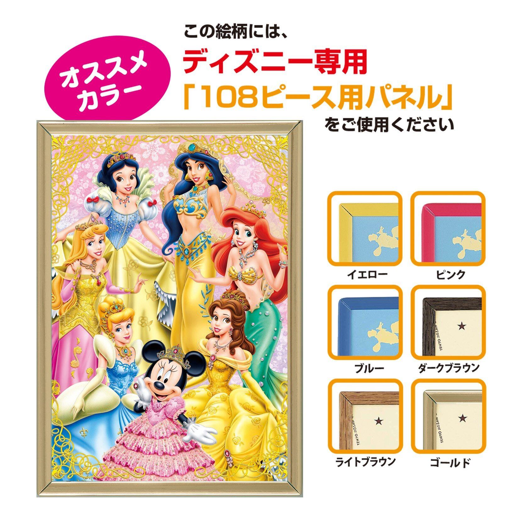 本商品『テンヨー ジグソーパズル ディズニー ゴールドプリンセス』は、108ピースの日本製パズルです。美しいディズニーのプリンセスたちが描かれたこのパズルは、完成サイズが18.2x25.7cmで、飾るにもぴったりです!ディズニーの魔法を感じながら、心ゆくまで楽しめます。