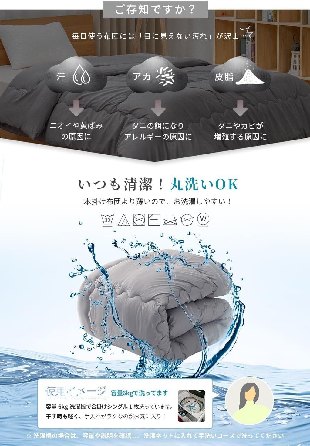 この掛け布団は家庭用洗濯機で丸洗い可能ですので、いつでも清潔に保つことができます。動きやすさと快適さを考えたデザインで、シワになりにくい素材を使用しているため、お手入れも簡単です。