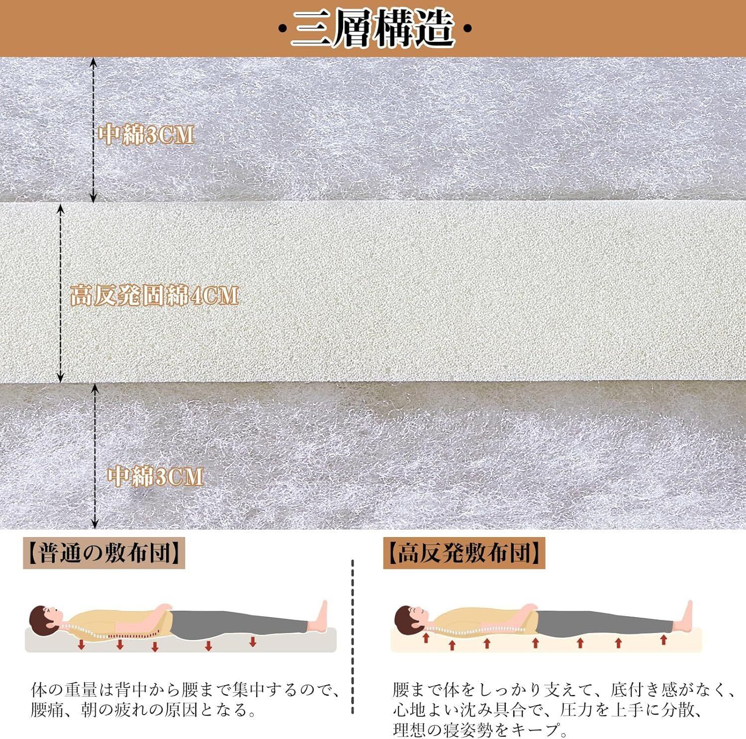 本商品『Topfinel 敷布団 シングル』は、シングルサイズ(100×200cm)で、しっかりとした厚めの設計が特長です。高反発素材を使用し、身体を優しく支えながら理想的な寝姿勢を提供します。三層構造により、体圧を分散させて快適な眠りをサポートします。