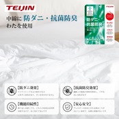 中綿に防ダニ・抗菌防臭のTEIJIN綿を使用しているので、細菌の増殖を抑制し、イヤな臭いを防いで、アレルギーの体質の方にも適しています。