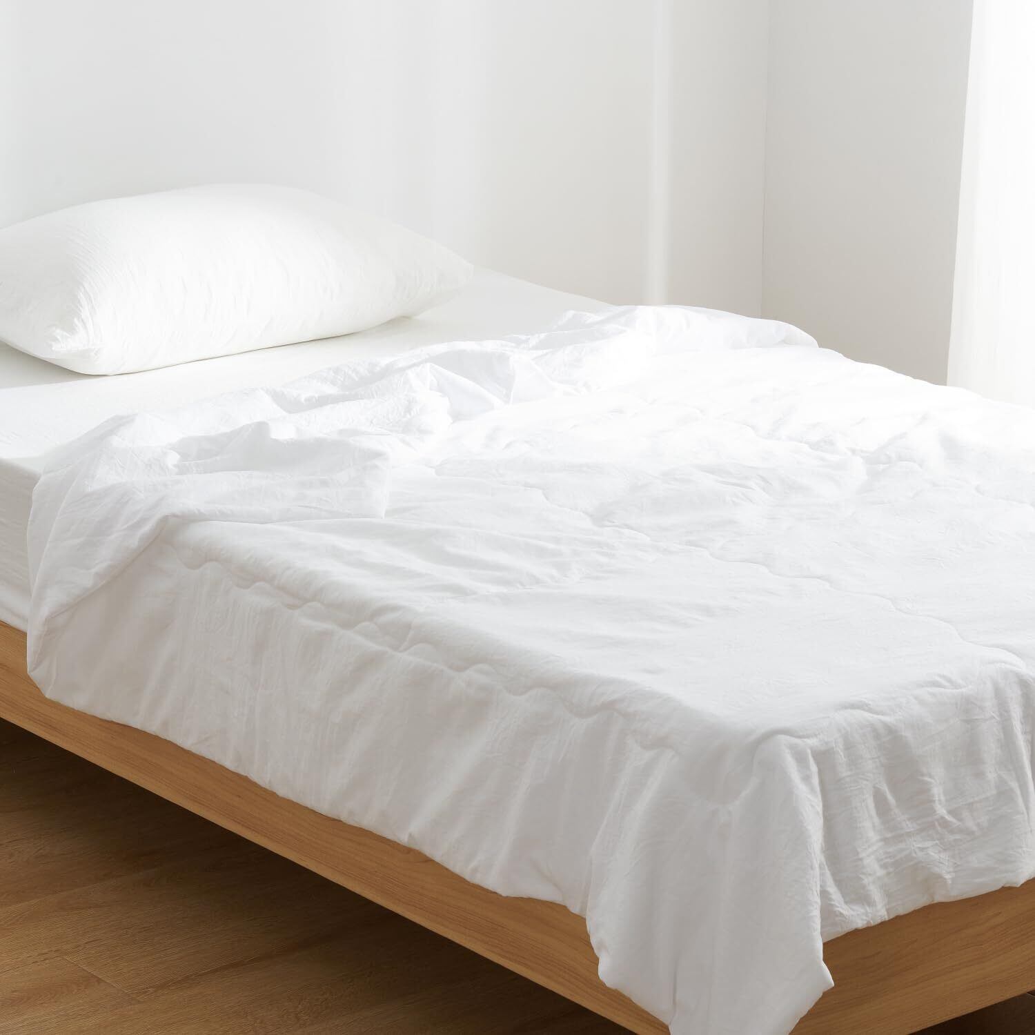 『Atokazo 肌掛け布団』は、ダブルサイズ(180×200cm)で軽量かつ薄手のデザインが特徴です。夏の暑い夜でも快適に眠れるように作られており、肌にやさしい素材が優しく包み込みます。クリーンなホワイトカラーは、どんなインテリアにもフィットします。