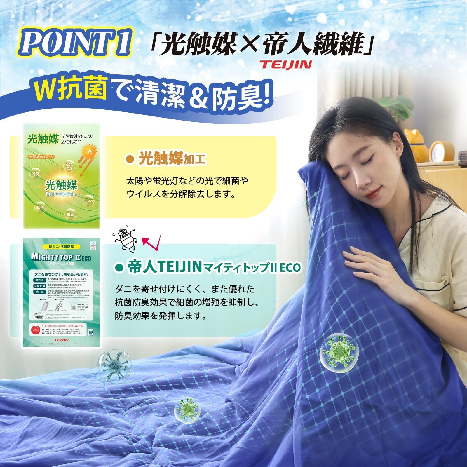 【光触媒除菌加工で清潔を保つ】掛け布団の表面には「光触媒」技術を使った除菌加工が施されており、細菌や臭いを抑えます。そのため、汗をかきやすい季節でも清潔な状態を保ち、快適な睡眠環境を提供します。