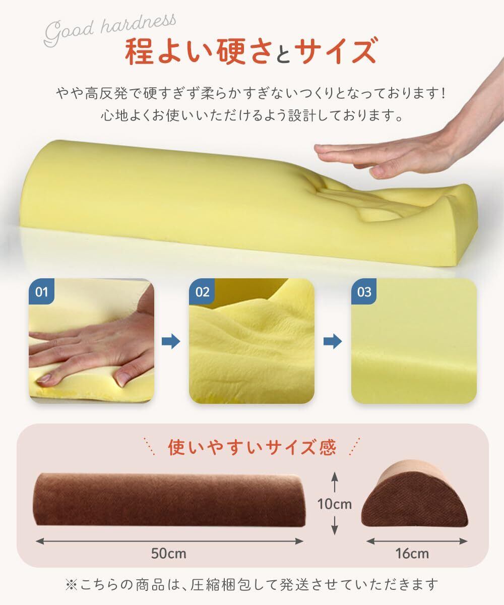 【程よい硬さとサイズ】 硬すぎず柔らかすぎない反発となっており、心地よくお使いいただけるよう製作しております。 長さ50×幅16×高さ10cm 【ベット以外でも自由自在に使える暮らしの万能必需品クッション】 専用足枕では寝るときしか使用できませんが、本商品は足枕やクッション、背もたれ、あぐら座布団として多用途に活用でき、身体をしっかりサポートします。 圧力を効果的に分散し、リラックスして快適さを楽しむことができます。