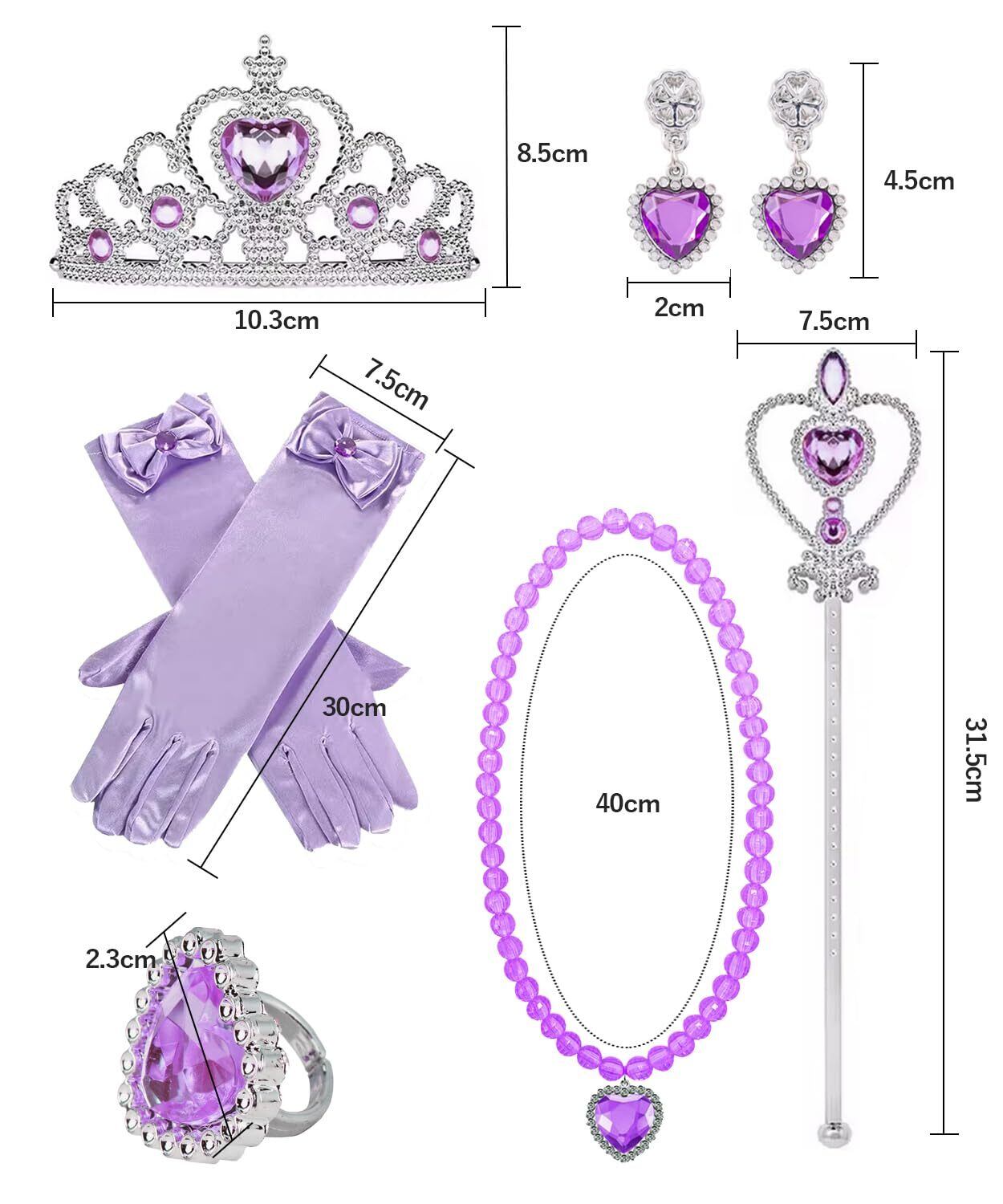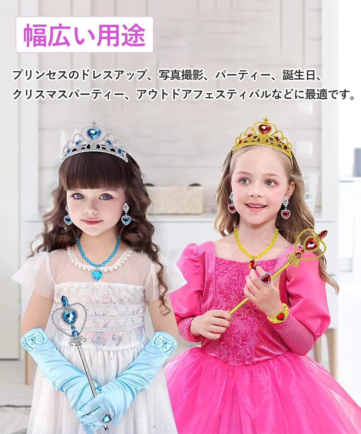 フルプリンセスコスチューム:セットには手袋、クラウン、杖、リング、イヤリング、ネックレスの6点が含まれ、お姫様の夢をかなえます。各アクセサリーは慎重にデザインされ、瞬時にお姫様に変身できます。