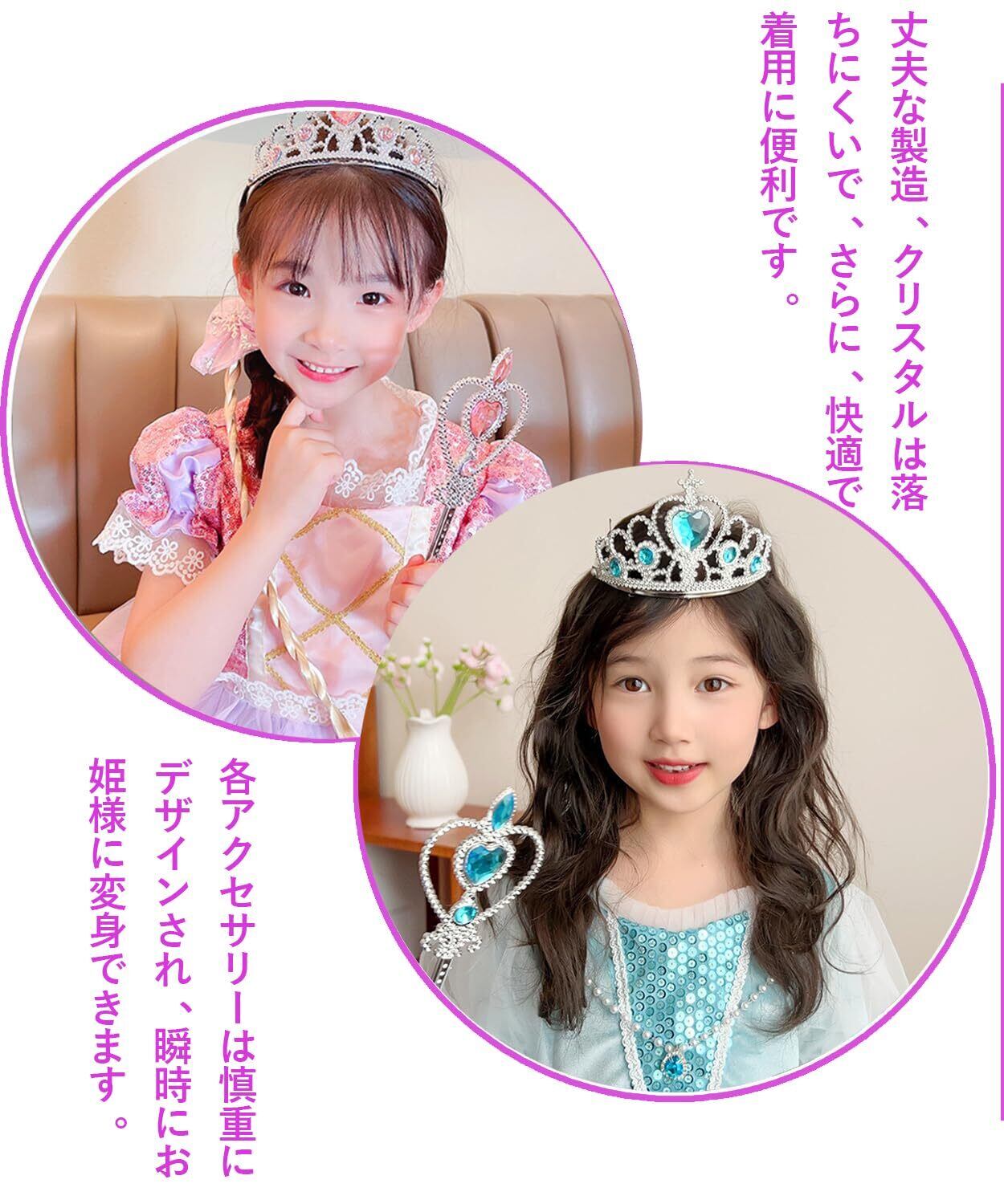 輝く水晶効果:このクラウンヘッドドレスキッズセットは環境に優しいプラスチック素材を使用し、リアルな水晶効果を再現。細部まで精密に加工され、透明感のある光沢が、どんな場面でもお姫様のように目立つこと間違いなしです。