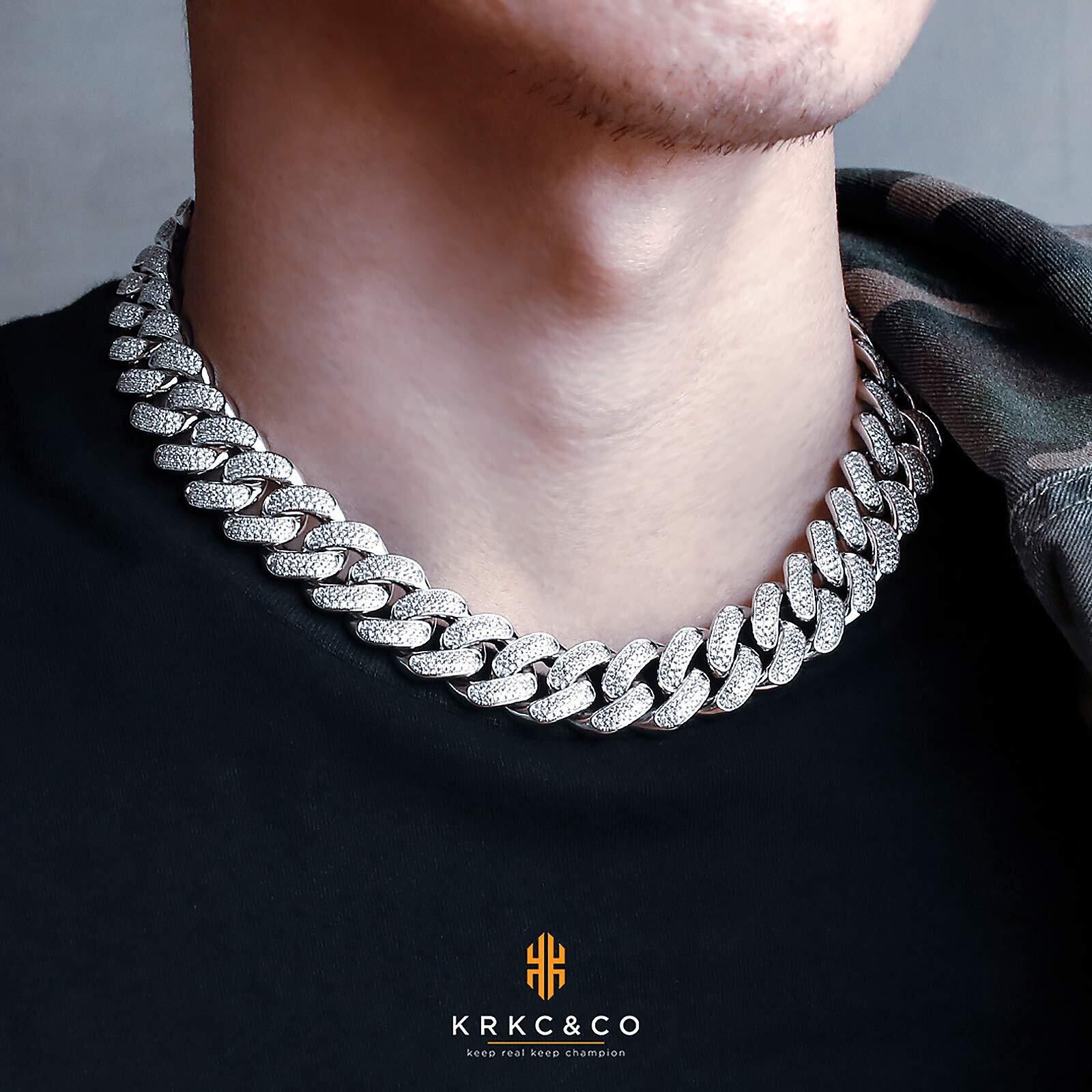 【存在感抜群のチェーン】B系アクセの人気デザイン、マイアミキューバンリンクのチェーンネックレス。表面には無数のジルコニアを散りばめており、光の当たり具合により輝きが魅力的に変化します。これ1本だけでも胸元で圧倒的な存在感を発揮します。