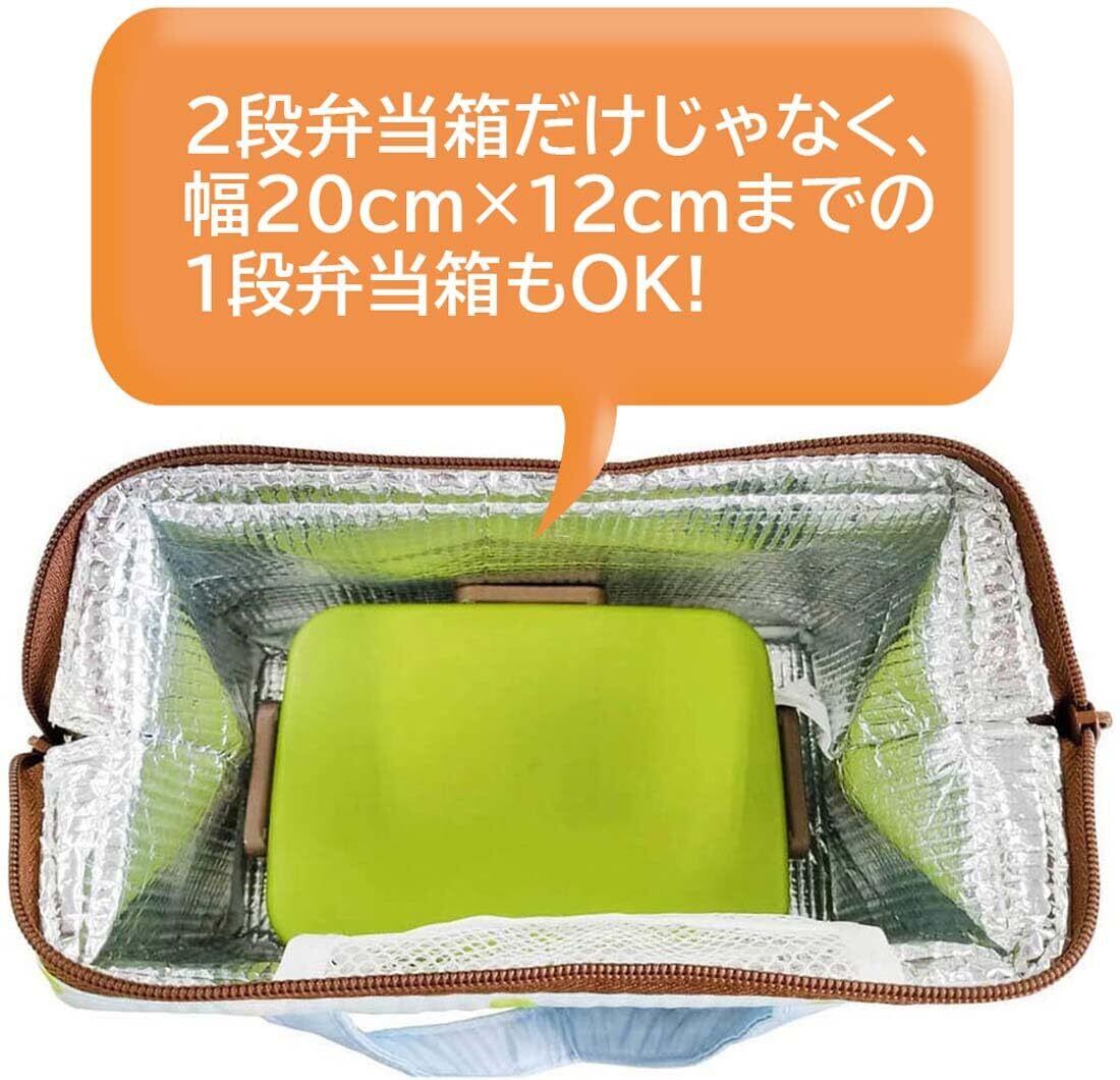 大きめのバッグなので2段のお弁当箱だけでなく小さな水筒も一緒に持ち運べます。また、内側はアルミ蒸着フィルムなので保冷をキープできます。保冷剤を入れるのにちょうどいいポケットも内側についています。ちょっとしたお出かけのサブバッグや普段使いとして小物などを入れてもOK!