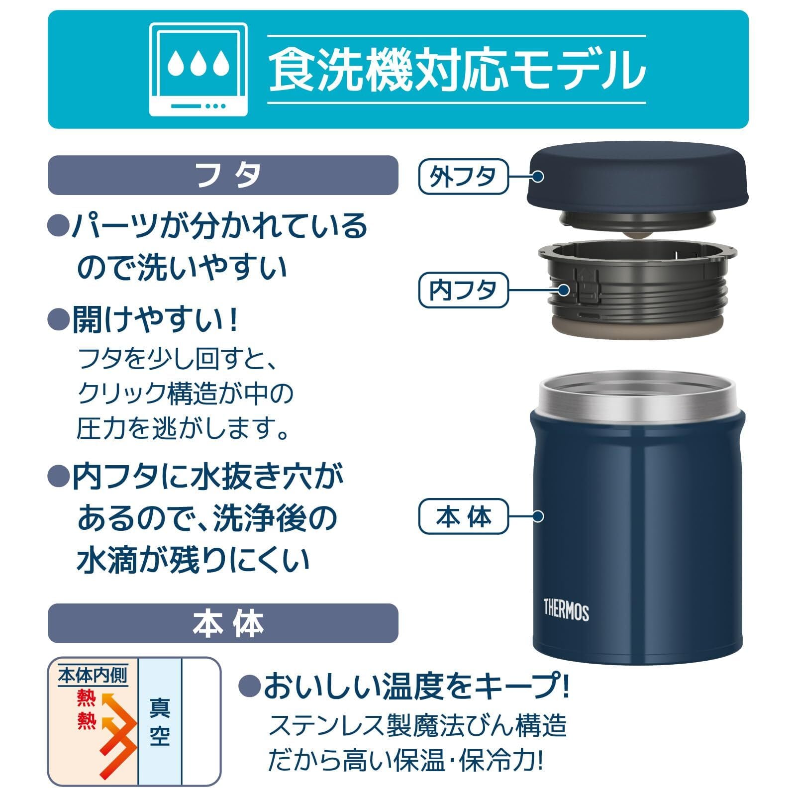 【食洗機対応モデル】 サーモス 真空断熱スープジャー 500ml ネイビーブルー 全パーツ食洗機OK 保温保冷 お手入れ簡単 口当たりがやさしい丸口設計 JEB-500 NB