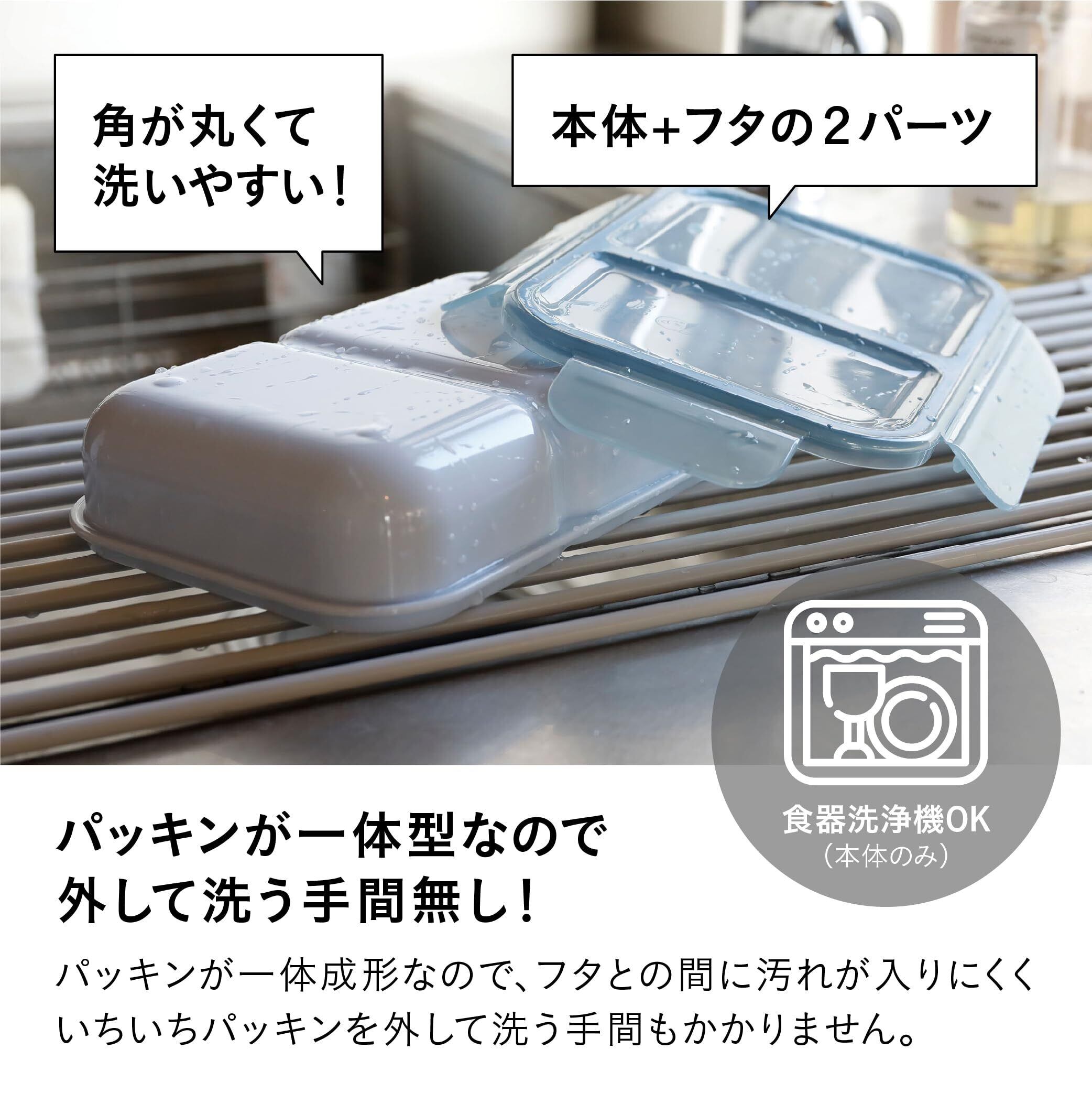 「パッキン一体型のフタ」と「本体容器」の2パーツなのでお手入れも楽々。食器洗浄器対応なので、日常使いにも最適です。※食器洗浄器で使用する際は、蒸気・熱風・熱湯の吹き出し口の側に置かないで下さい。変形や破損の原因になります。