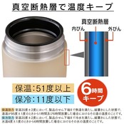 『アイリスオーヤマ 真空断熱スープジャー ゴールド』は、温かいシチューやカレーを、どこでも美味しく楽しむための理想的なアイテムです。300mlの容量は、お弁当や軽食にぴったり。真空の二重構造により、保温51度以上、保冷11度以下を最大6時間キープする優れた性能を実現しています。
