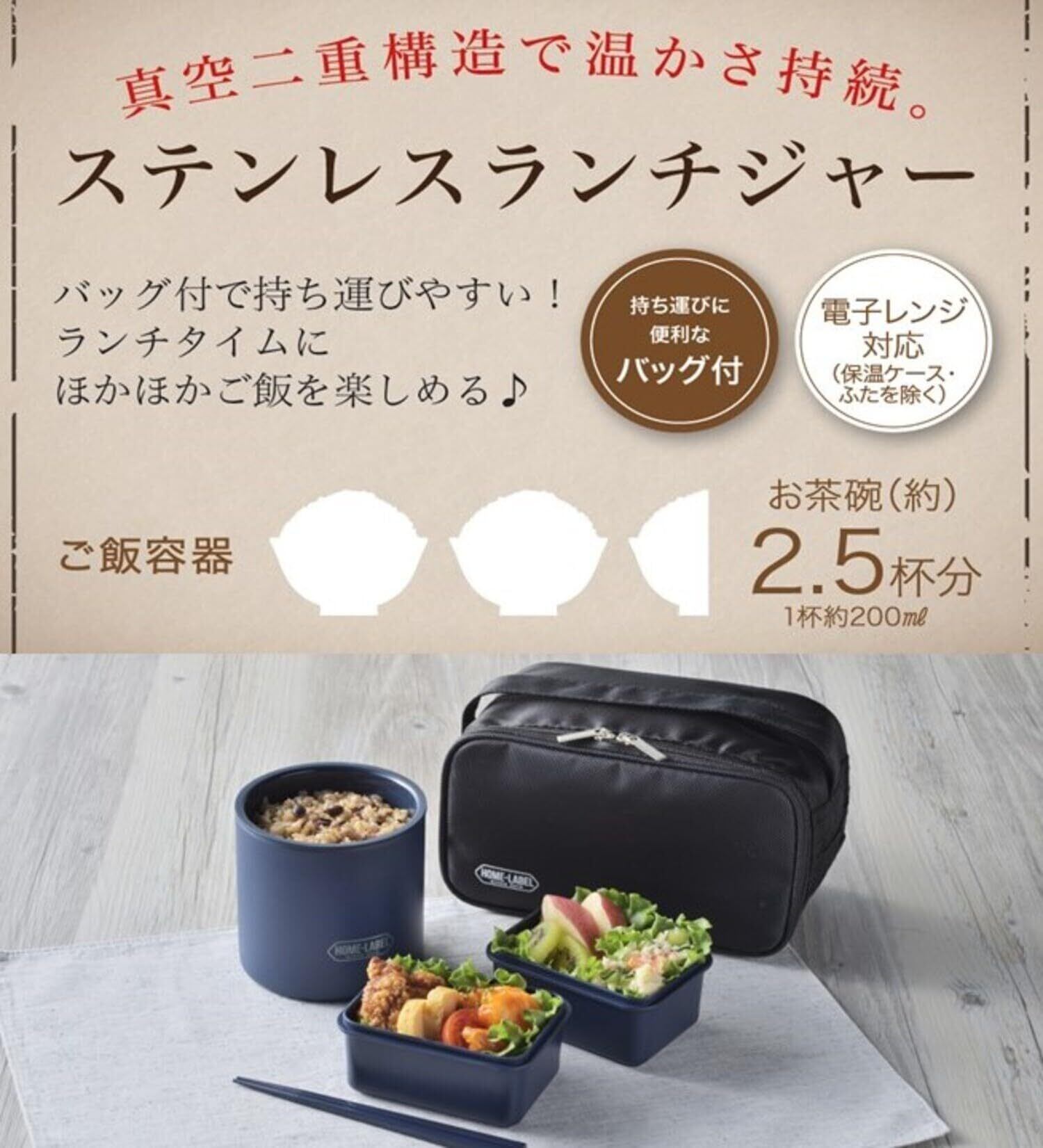品名:ステンレス製まほうびん(弁当用ジャー)、実容量:ご飯容器/520ml、おかず容器/280ml×2個、保温効力:専用ランチバッグに入れない場合/43度以上(6時間)、専用ランチバッグに入れた場合/51度以上(6時間)