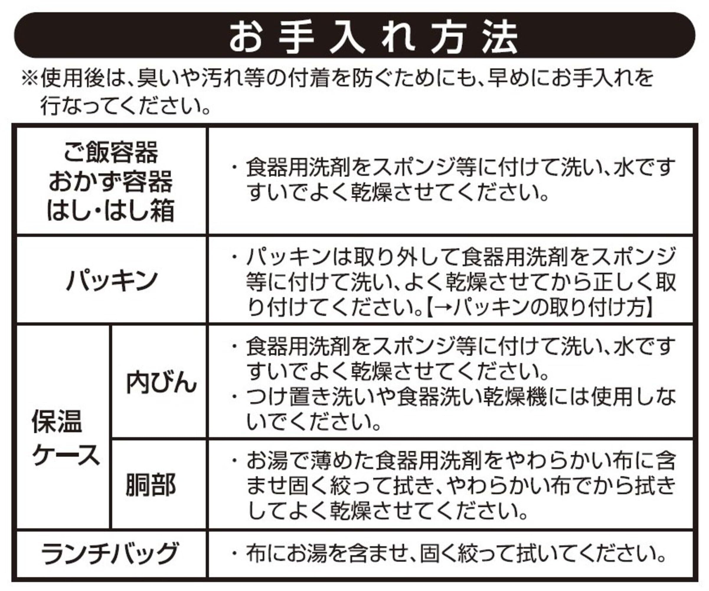 素材・材質:保温ケース(内びん)/ステンレス鋼、(胴部)/ステンレス鋼(アクリル樹脂塗装)、ご飯容器(本体)/ポリピロピレン(耐熱温度140度・耐冷温度-20度)、(ふた)/ポリプロピレン(発泡スチロール内臓)(耐熱温度80度・耐冷温度-20度)、(パッキン)/シリコーンゴム(耐熱温度180度・耐冷温度-20度)、おかず容器(本体・ふた)/ポリプロピレン(耐熱温度140度・耐冷温度-20度)、(パッキン)/シリコーンゴム(耐熱温度180度・耐冷温度-20度)、はし・はし箱/ABS樹脂(耐熱温度80度・耐冷温度-20度)、ランチバッグ(本体・取っ手)/ポリエステル、(中芯)/ポリエチレン