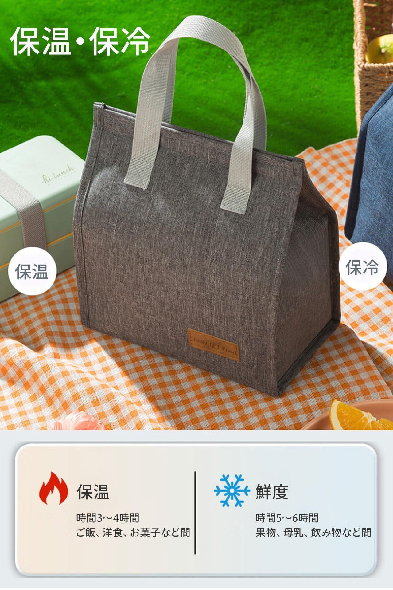 厚手の断熱素材を使用しており、食材を長時間しっかり保温・保冷します。特に暑い季節や寒い季節にこだわりのある方に最適で、外出先でも安心して新鮮なお弁当を楽しんでいただけます。大切な食材を守るための理想的なバッグです。