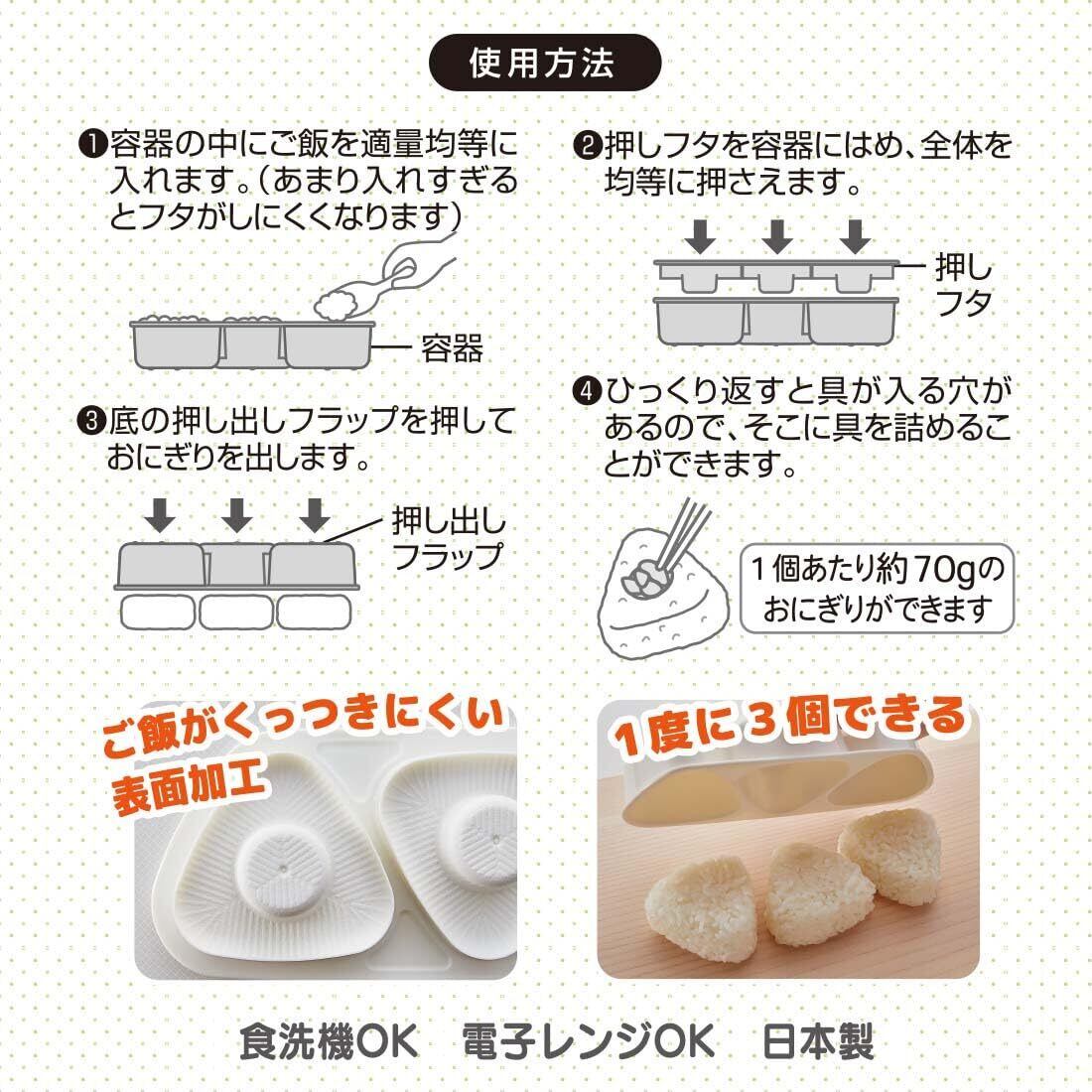 本商品は、食品安全基準に沿った素材を使用しており、お子様にも安心してご利用いただける設計です。耐久性も備えているため、長く愛用できるおにぎり押し型となっています。簡単に美味しいおにぎりが楽しめるのが魅力です!