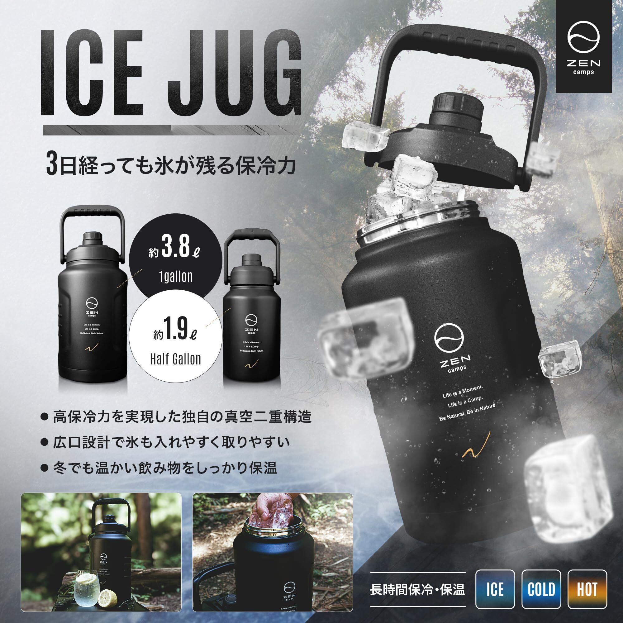 ZEN Camps アイスジャグ アイスコンテナ 保冷 保温 キャンプ アウトドア 真空断熱構造 1.9L 3.8L 口広 (1ガロン)