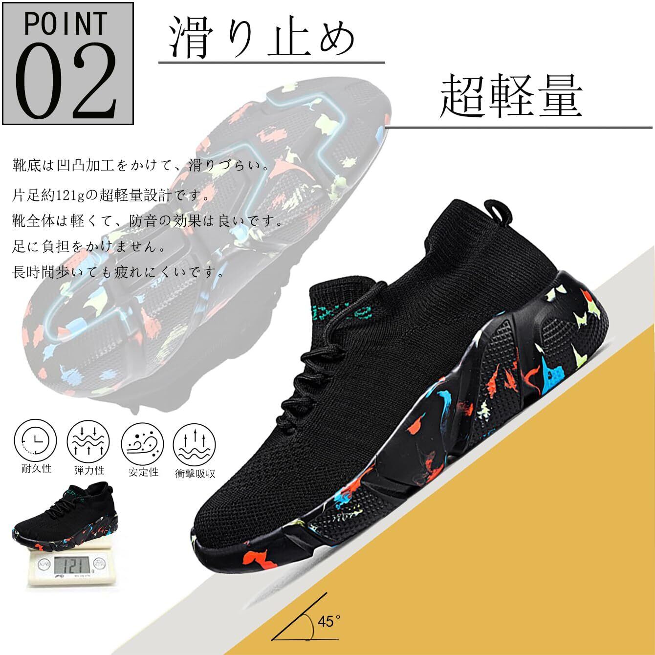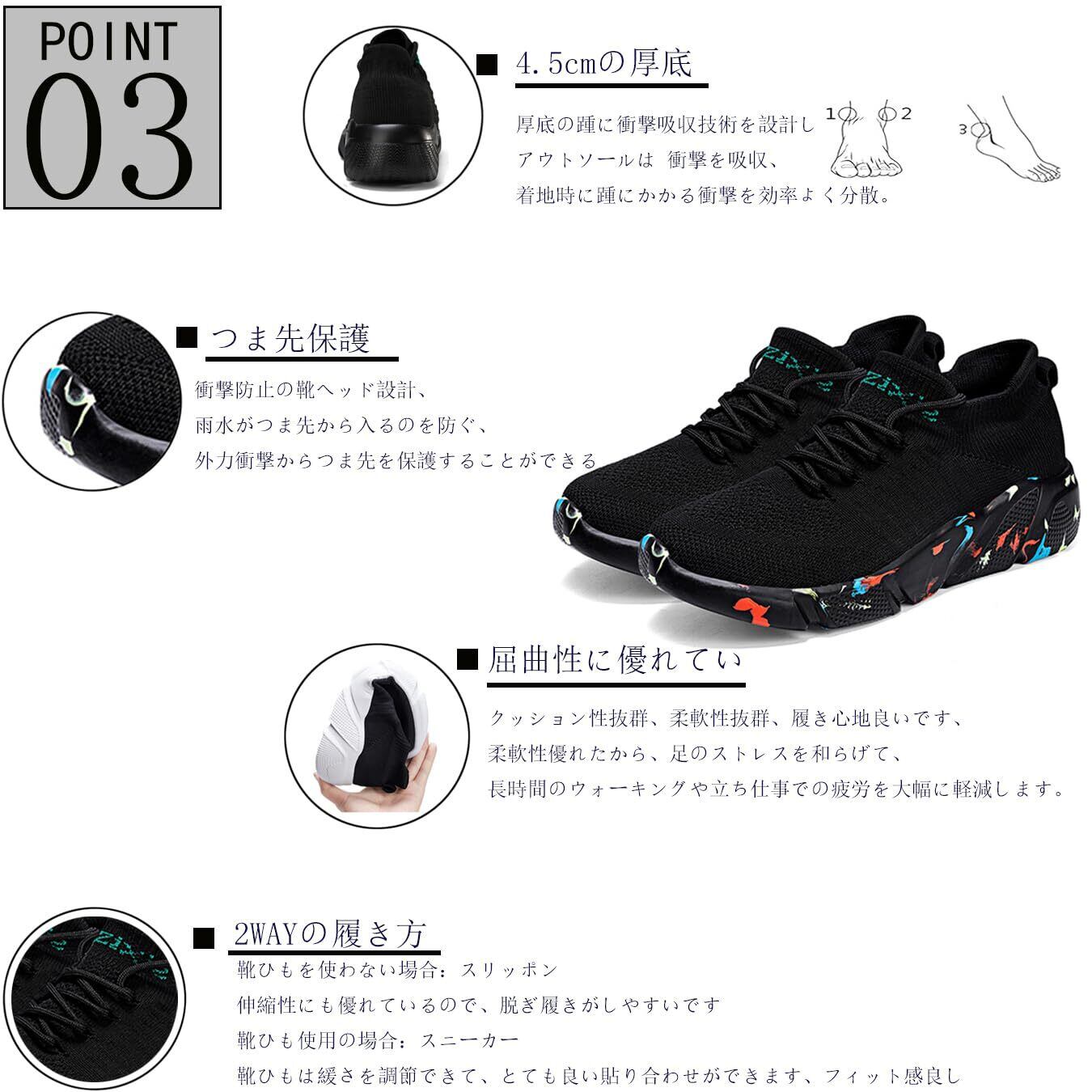【通気性と滑り止め】靴の表面は飛線編みの技術を採用しています。メッシュ シューズは軽量、通気、速乾などの機能が優れており熱がこもりにくく蒸れにくい特徴を持っています。熱がこもるのを防ぎ、さわやかな履き心地を提供してくれます。一日履いても蒸れにくいです。このスニーカーは春 夏 秋 冬どちらでも履ける、着用時の季節を選びません。靴底には防滑と丈夫な素材を採用しており、粒状の模様加工されるのによって、凸凹のついたノンスリップ底が、運動靴の靭性が良くて摩擦にも強いです、従来のスニーカーソールの防滑性能を改善して、地面との摩擦力を増やして滑り止め効果がより一層アップ。