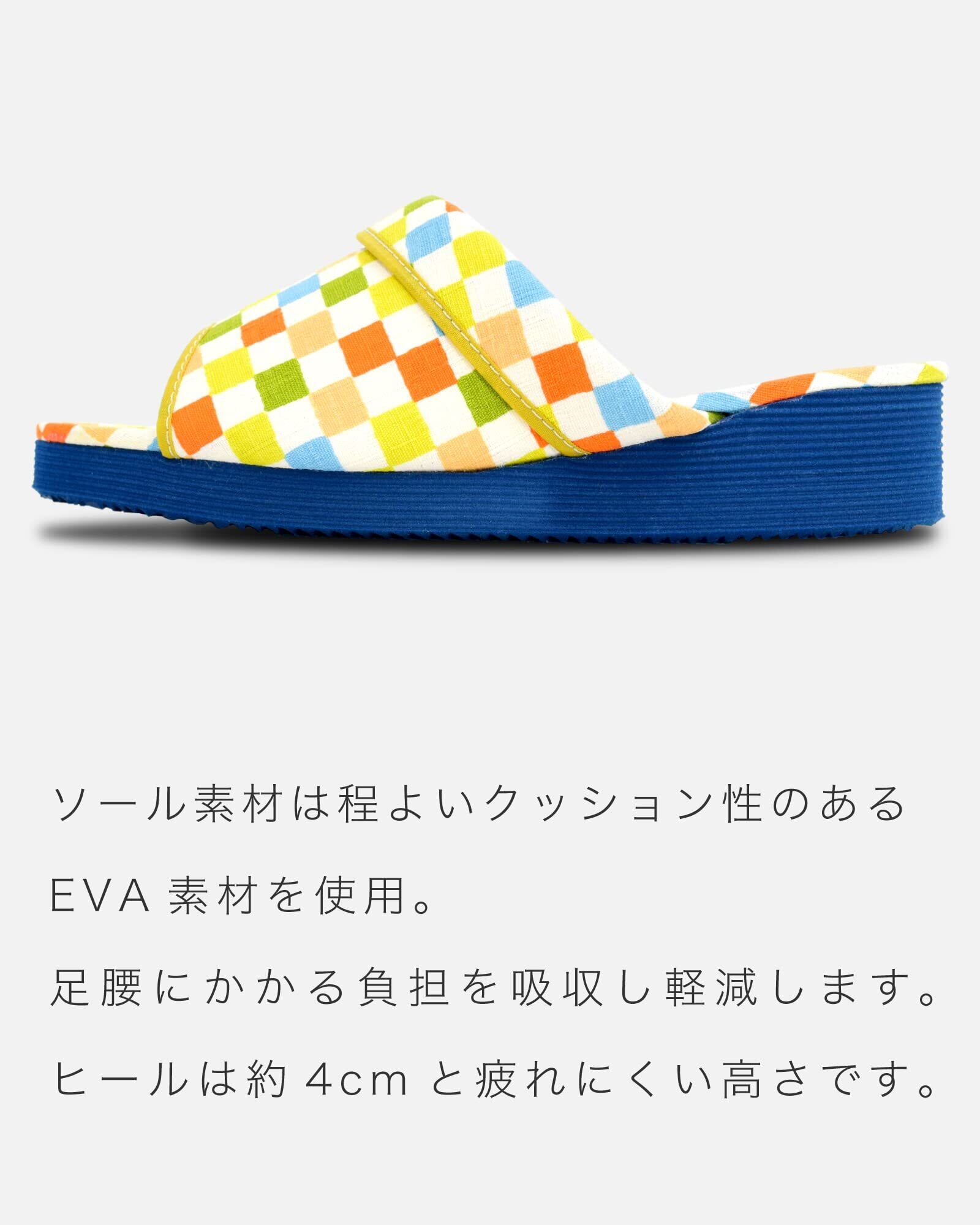 ソール素材は程よいクッション性のあるEVAを 使用。足腰にかかる負担を吸収し軽減します。ヒールは約4cmと疲れにくい仕様です。