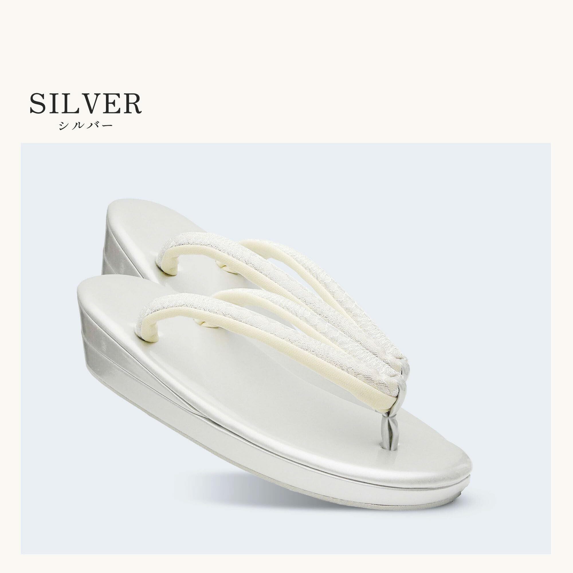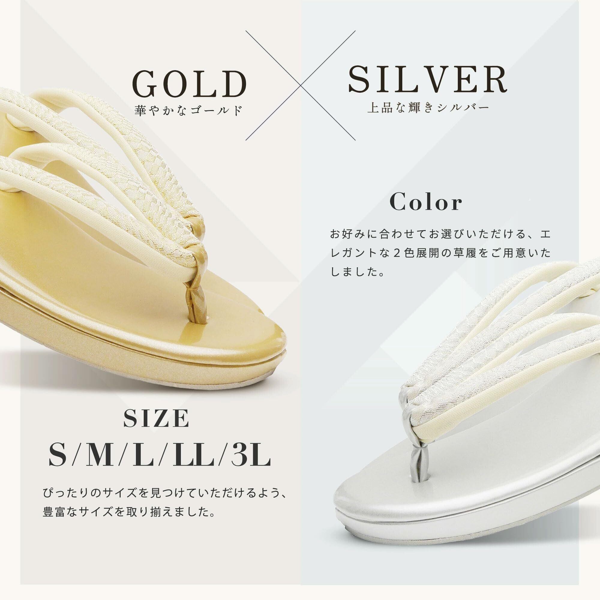 『[NISHIORI] 草履』は、伝統的な市松模様の鼻緒を採用したフォーマル用草履です。美しいゴールドとシルバーの配色が、和装やフォーマルな装いにぴったりマッチし、あなたの気品を一層引き立てます。