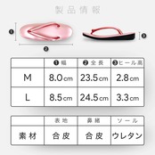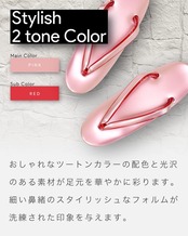 おしゃれなツートンカラーの配色と光沢のある素材が足元を華やかに彩ります。細い鼻緒のスタイリッシュなフォルムが洗練された印象を与えます。