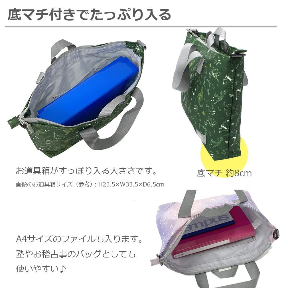 8cmのマチ付きで、おどうぐ箱がすっぽり入ります。荷物が多い日用の大容量タイプです。A4ファイルも余裕で入るので、塾やその他習い事のバッグとしても◎