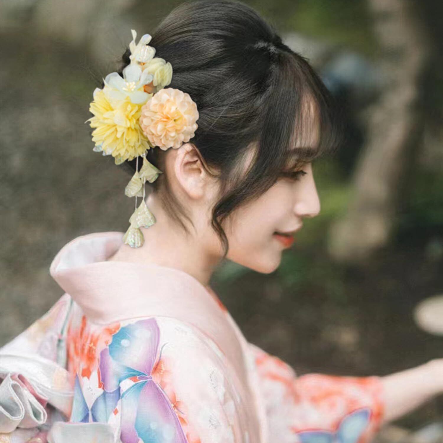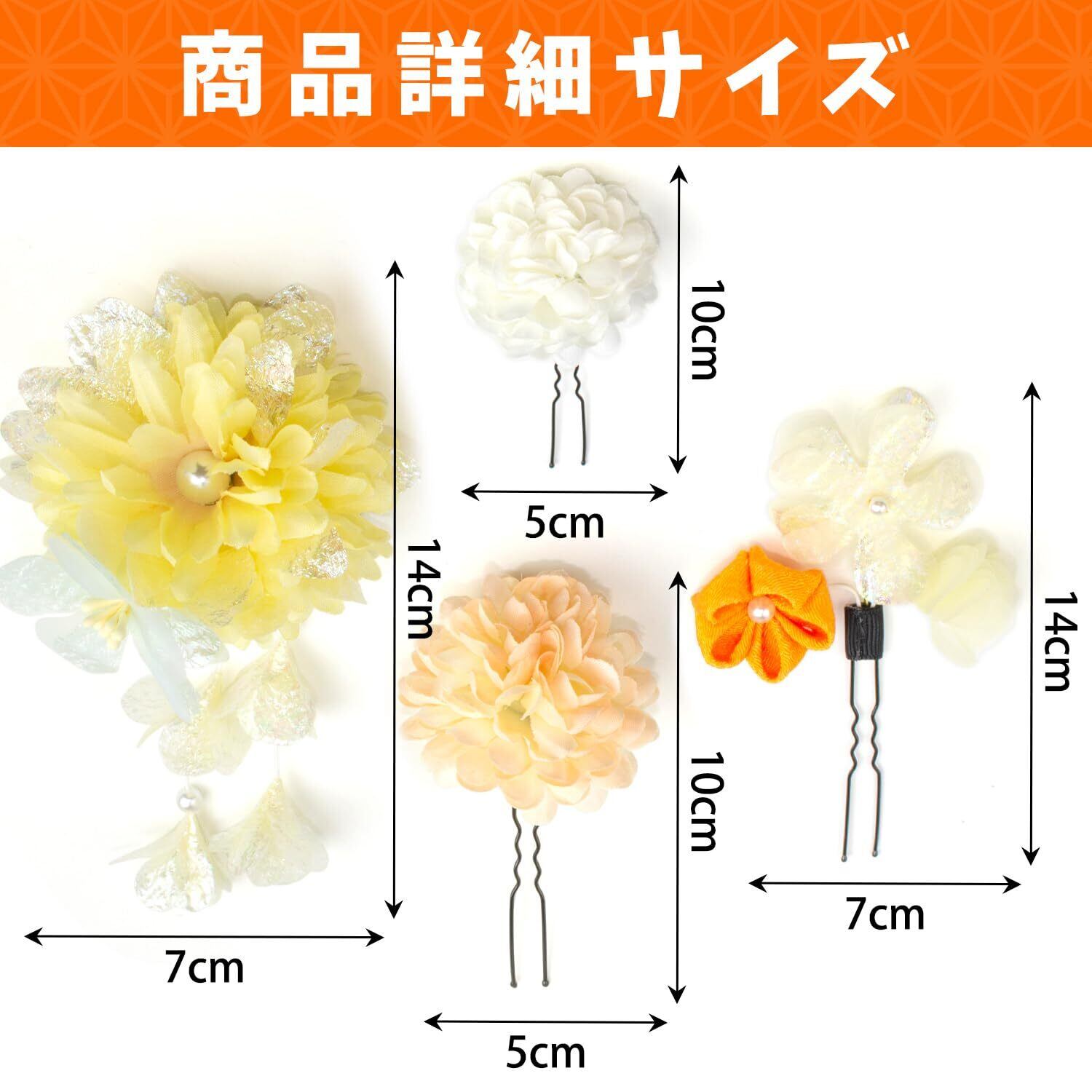 「様々なスタイルに」この髪飾りには、サイズ異なる花が用意されています。ヘアスタイルやイベントに応じて、自分の好みに合わせて選ぶことができ、さまざまなヘアアレンジが可能です。左右に分けてつけたり、あえて片側に寄せてボリュームを出したり、まさにオシャレにぴったりの髪飾りです。小さめの飾りは浴衣に合わせて、とっても華やかで、特別感のあるおしゃれを楽しめます。