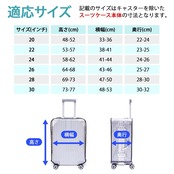 【適応サイズ】 下記に記載のサイズは、キャスターを除いたスーツケース本体の寸法となります 20インチ 約50×36×22 22インチ 約55×40×24 24インチ 約60×42×26.5 26インチ 約65×45×28 28インチ 約70×49×29 30インチ 約75×56×35