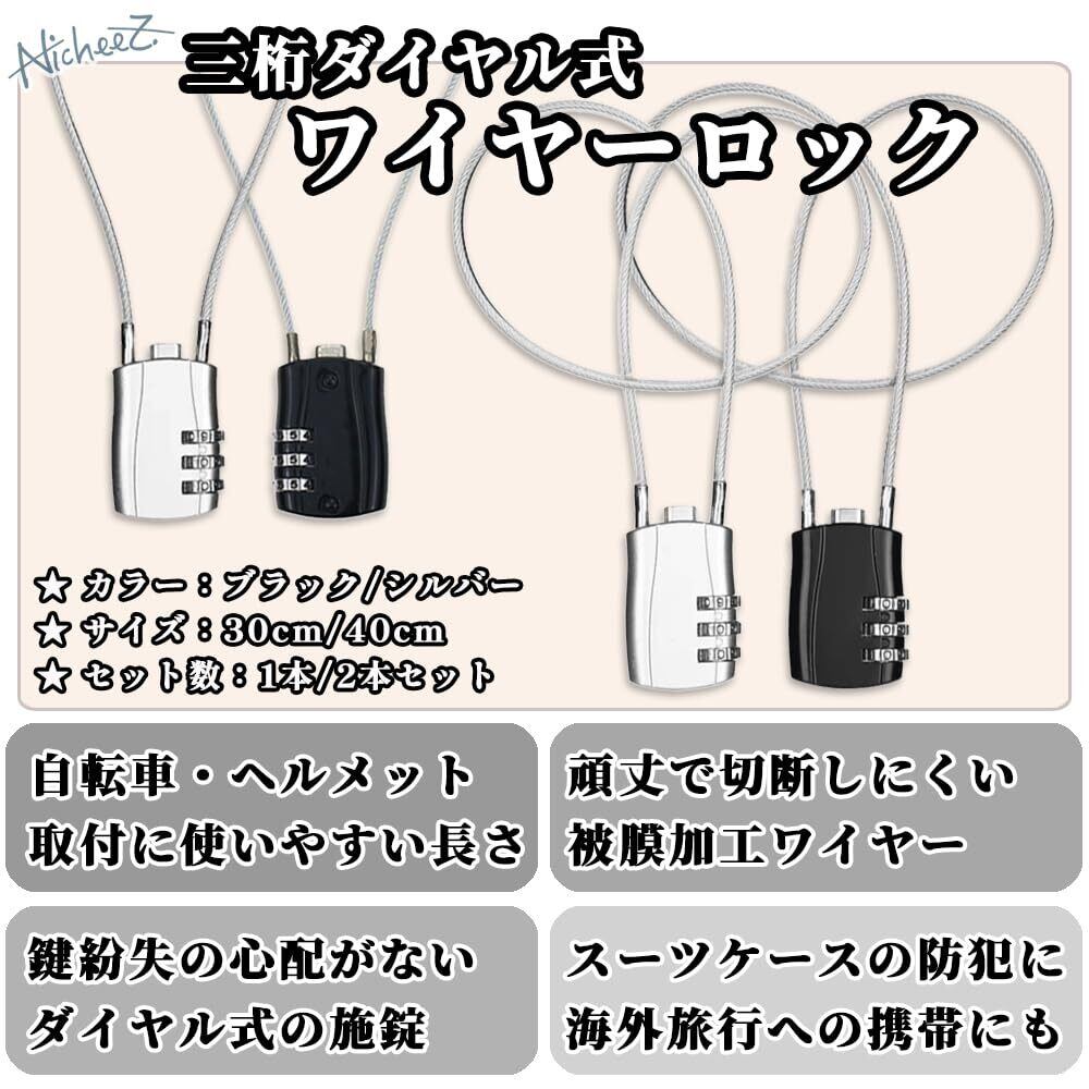 【用途に合わせて便利に使える2本セット】長さは旅行にも日常にも使い勝手の良い30cmと40cmの2種類をご用意。カラーはブラックとシルバーの定番2色で、シーンを選ばないシンプルデザイン。鍵本体は亜鉛合金製で防錆・防水性に優れ、小型で軽量ながら頑丈で切断されにくい◎ PVC被膜加工のワイヤーは巻き取りやすく、使う物や手を傷つけにくい仕様です。旅行用と日常用に分けたり、家族でシェアして使える便利な2本セットです。