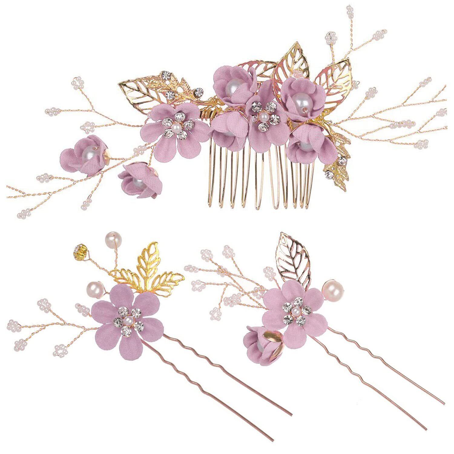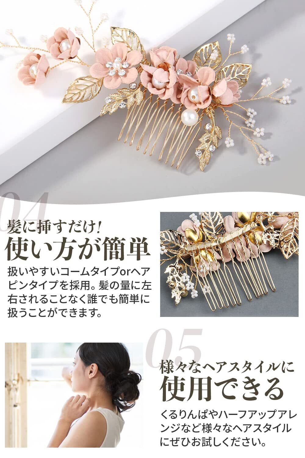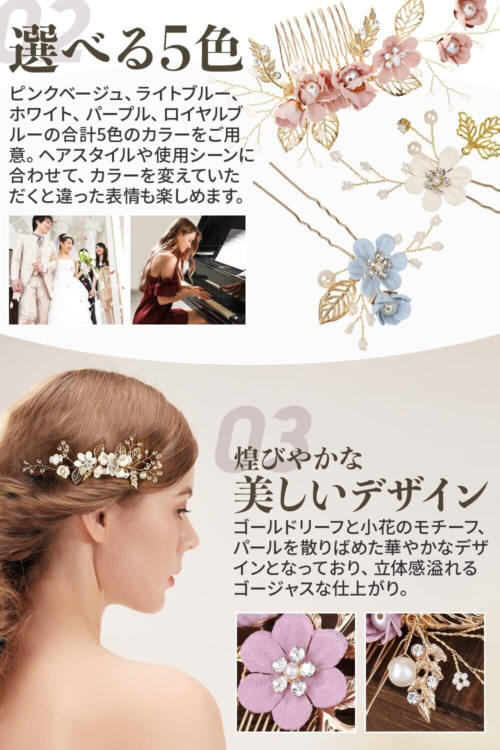 【 選べる5色 】 本製品は、ピンクベージュ、ライトブルー、ホワイト、パープル、ロイヤルブルーの合計5色のカラーをご用意しております。ゴールドリーフと可愛い小花モチーフ、パールを散りばめた華やかなデザインとなっており、立体感溢れるゴージャスな仕上がりになりますヘアスタイルや使用シーンに合わせて、カラーを変えていただくと違った表情も楽しめます。お好みに合わせてお選びください。