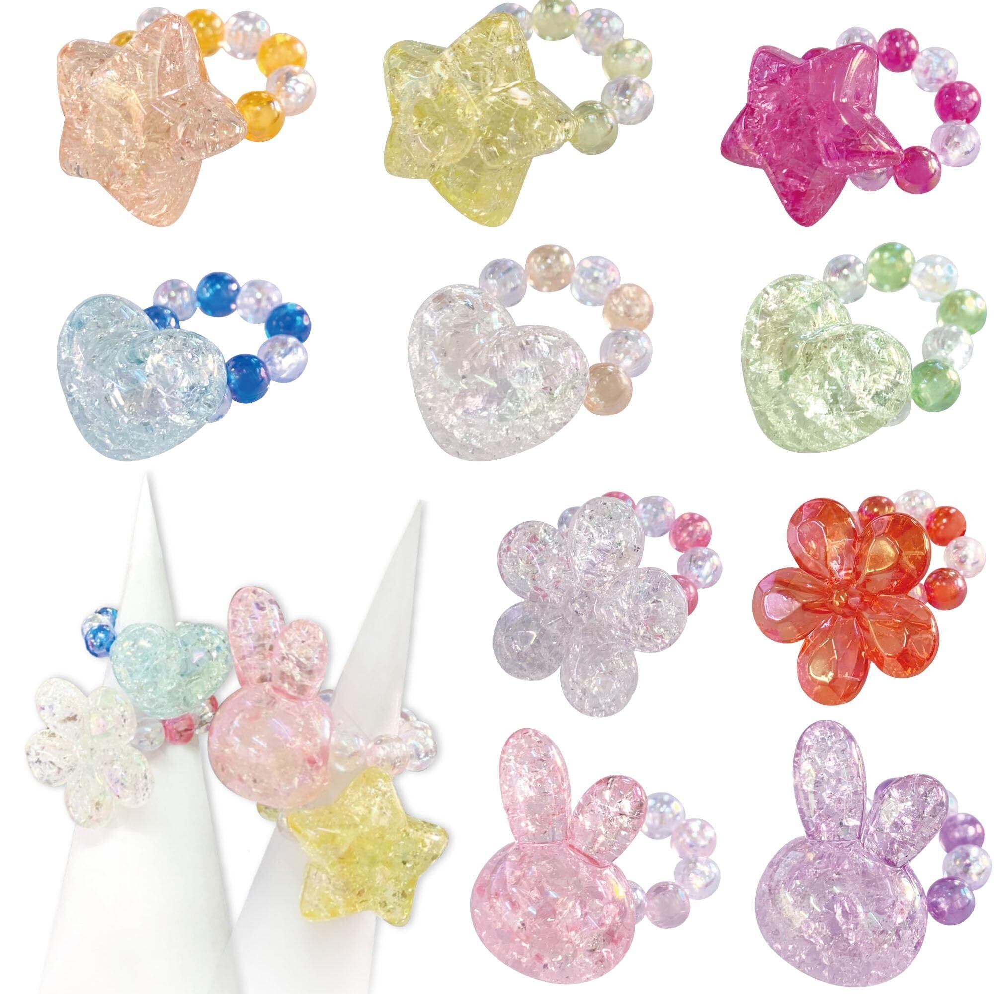 宝石おもちゃ 宝石 アクセサリー BIG 宝石リング 指輪 ( スター ハート うさぎ フラワー) 全10種×1個 計10個セット ( 小容量 ご家庭 子供会 お楽しみ会 誕生日会 向け) クラック加工 ゴム調節可能 クリスタル 宝石 子供 女の子 ファッション オシャレ アクリル アクリル宝石 おもちゃ 玩具 ダイヤモンド ジュエリー アクセサリー 宝物さがし 宝石探し 宝石すくい つかみどり イベント 装飾 オーナメント