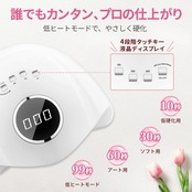 【4段階タイマーモードで自由設定】 硬化ライト 10秒、30秒、60秒、99秒の4段階タイマーを搭載し、ネイルの種類や厚さに応じて最適な硬化時間を自由に選択可能。薄いコートは10秒で素早く硬化、厚塗りや特殊なネイルアートは99秒で丁寧に仕上げられ、細かい調整も簡単です。