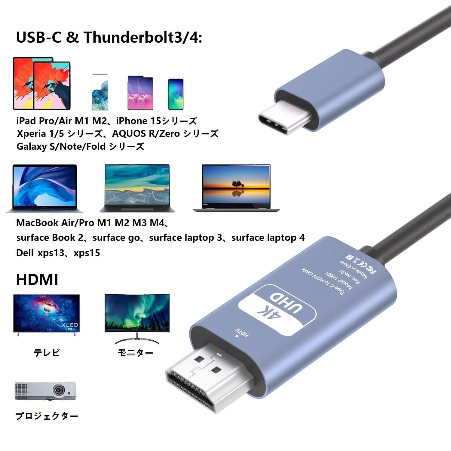 USB C HDMI 変換ケーブル - 1M 「4K@30Hz 映像出力 Thunderbolt3/4互換 設定不要/在宅勤務」 HDMI TypeC 接続ケーブル iPhone15 Pro/Max、MacBook Air/Pro、iPad Pro、Huawei MateBook、Surface Book、Galaxy S22/S22+などAndroid対応 - グレー