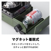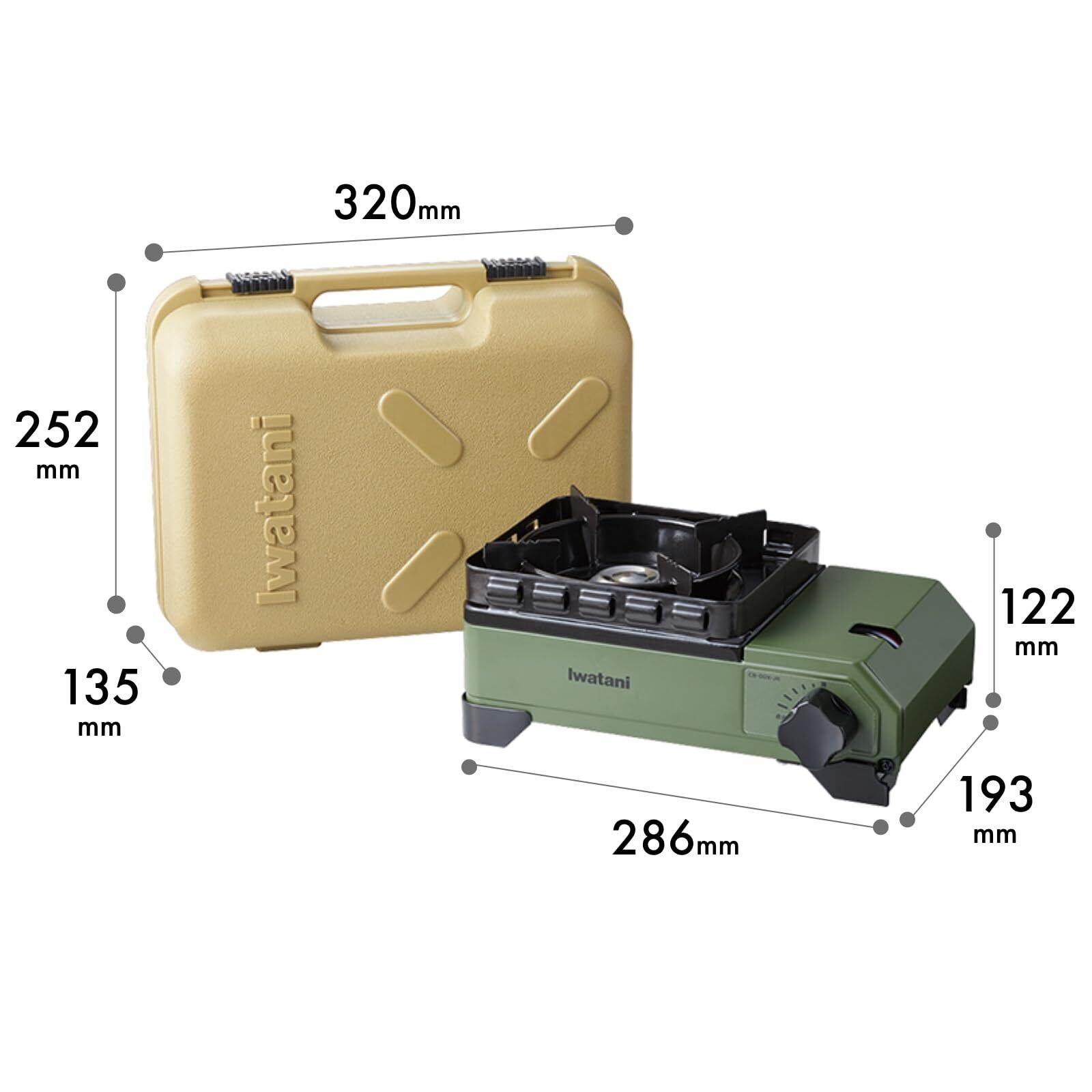 【仕様】[メーカー型番]CB-ODX-JR-OL、[本体サイズ]286×192.5×122mm、[商品重量]約1.6kg、[カラー]オリーブ、[生産国]日本、[連続燃焼時間]約102分※上記はイワタニカセットガス/パワーゴールド使用時※イワタニカセットガスジュニア使用時は、約45分(気温20~25℃のとき強火連続燃焼にてカセットボンベを使い切るまでの実測値)、[点火方式]圧電点火方式【材質】[本体] SPCC(鋼板)、[フレーム] SPCC(鋼板)、[容器カバー]SPCC(鋼板)、[トップパネル]SPP(ホーロー用鋼板)、[バーナー]SUS430(ステンレス鋼板)、[点火つまみ] ABS樹脂、[収納ケース] PE