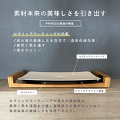 ●ご注意 セラミックのメリットは熱伝導性の良さ。加えて遠赤外線効果もあり、こんがりと食材表面を焼き上げる。反面火加減を強くしすぎると焦げ付く事もあるので注意が必要です。金属へらや金属たわしは使用しないで下さい。 万が一焦げ付いてしまった場合は、お湯で湿らせた柔らかいフキンやキッチンペーパーを焦げ付いた部分に置き、しばらく蒸らし、焦げを緩めてから優しく落として下さい。洗剤を御使用になる場合は中性洗剤をご使用下さい。 《傷防止シールについて》 温度調節ダイヤル、PRINCESSロゴ上の傷防止シールを剥がしてご使用ください。 《感熱棒について》 感熱棒は鉄の成型過程において若干変色、及び先端が滑らかではない場合がございますが、 品質には影響はございませんのでご安心ください。 お困りの際はサポートセンターへご相談ください。 ●期間 お買い上げより1年間
