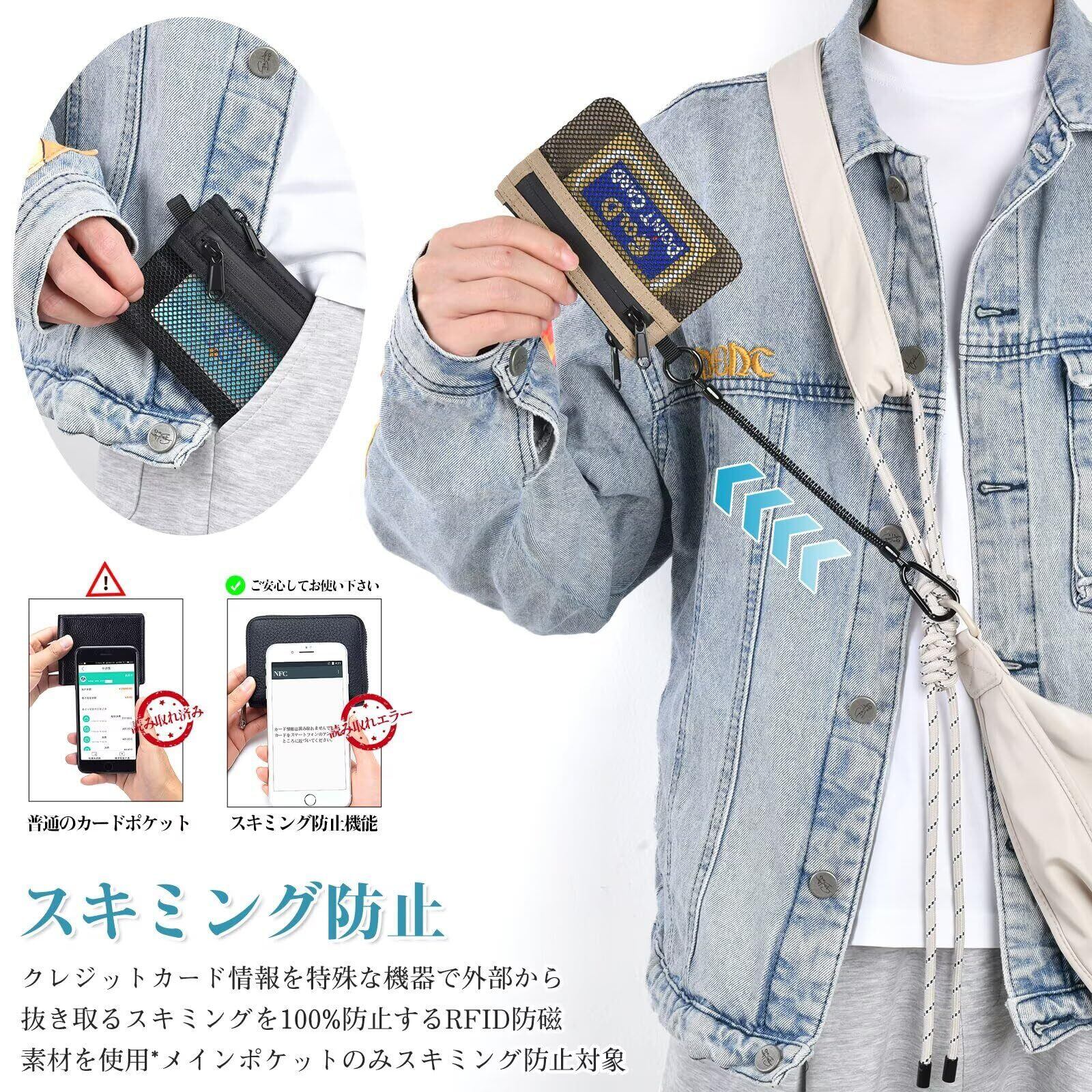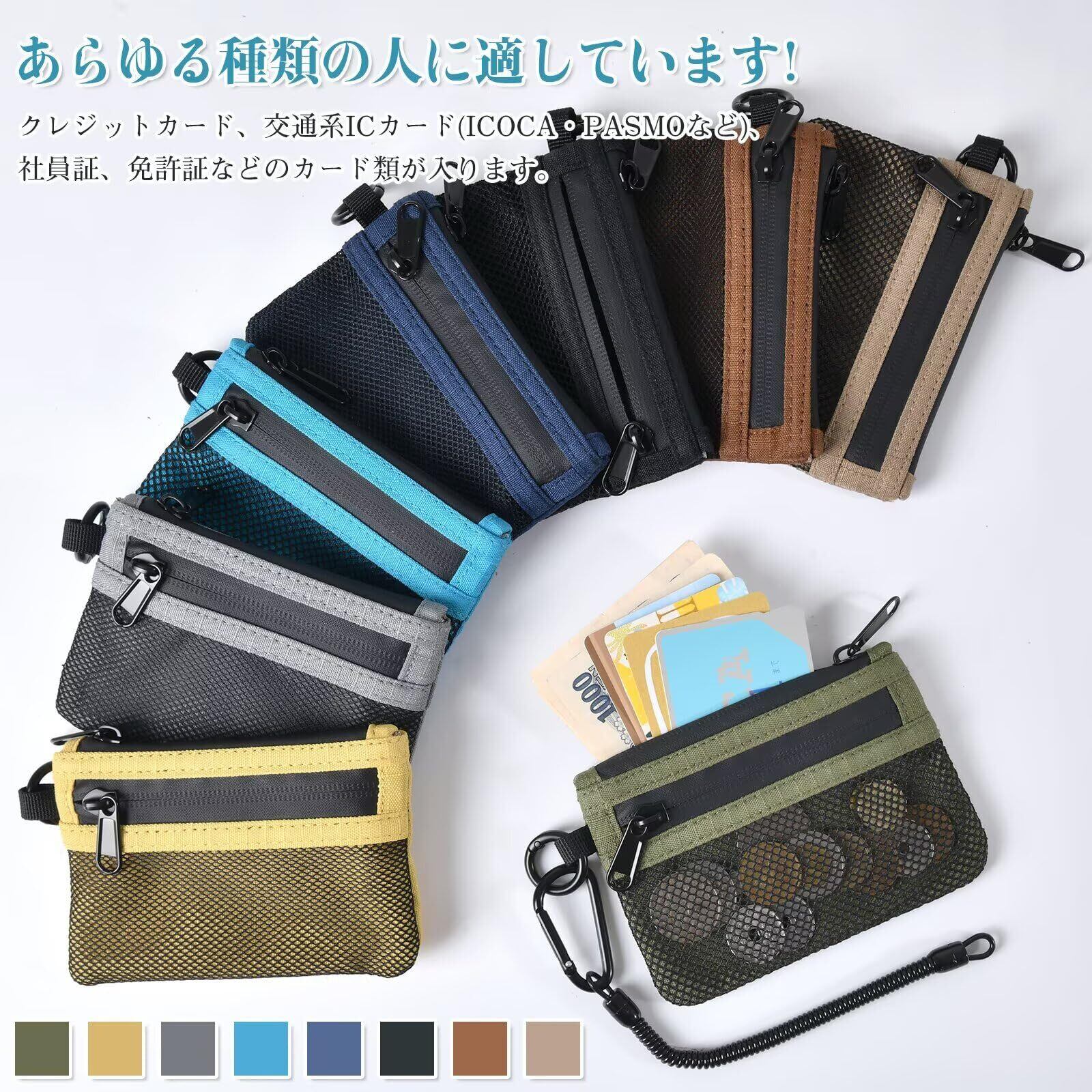 【多機能パスケース】パスケースはスパイラルコード付き 両面にファスナーがついておりそれぞれ収納できます。カラビナがついているので腰のベルト入れ部分などにぶら下げてポケットに収まります。 利用する際にパスケースをポケットから取出し手を伸ばすとスパイラルコードが伸びて即座に出し入れして使うことができます。