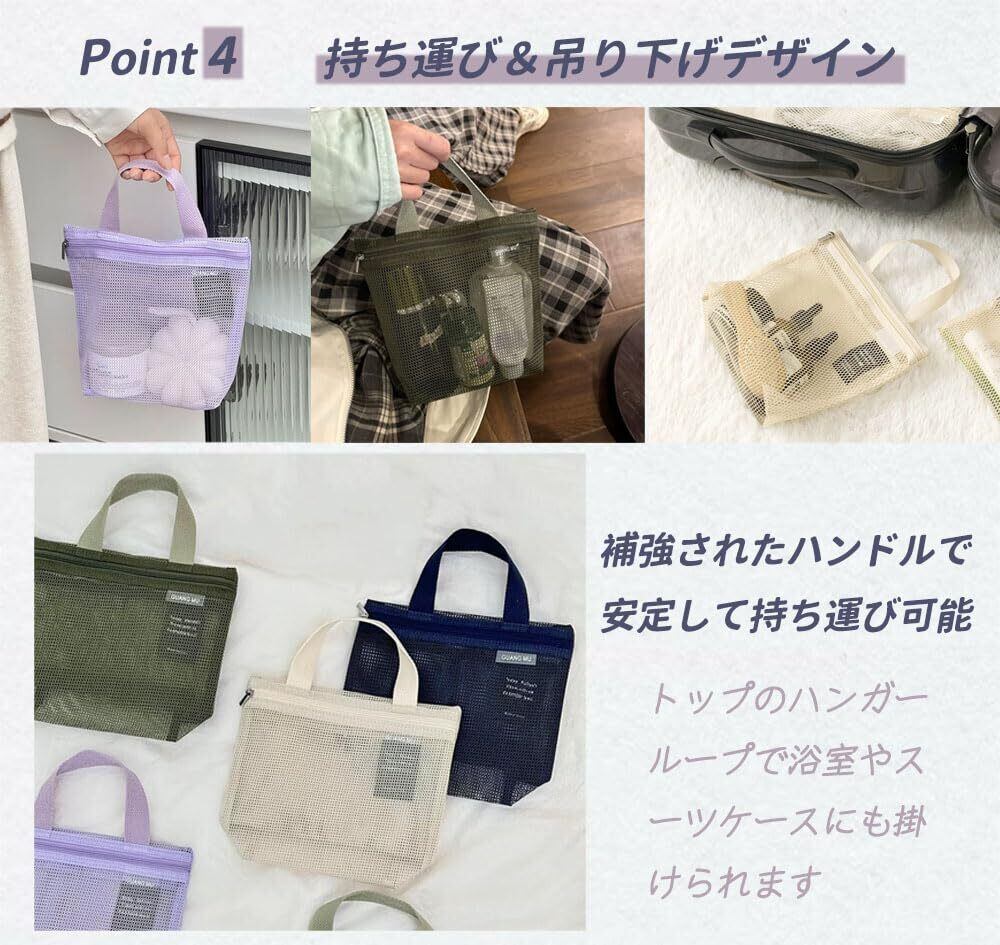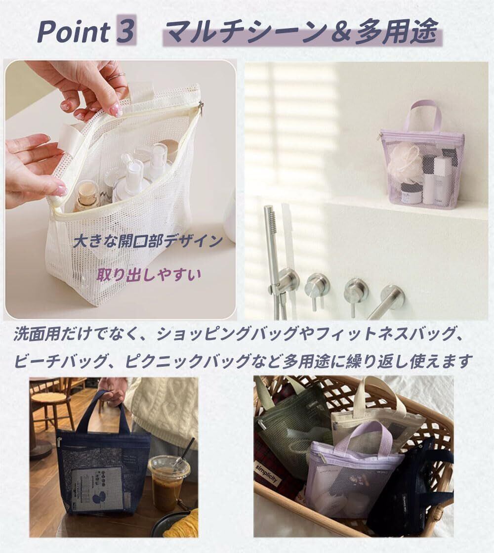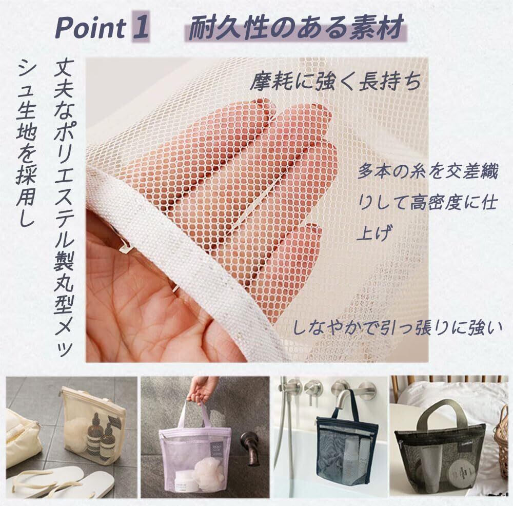 耐久性のある素材:耐久性に優れたポリエステル製の丸型メッシュ素材を使用し、通気性も良く、濡れたものも安心して収納可能。洗濯機で丸洗い可能で乾きやすく、お手入れも簡単。