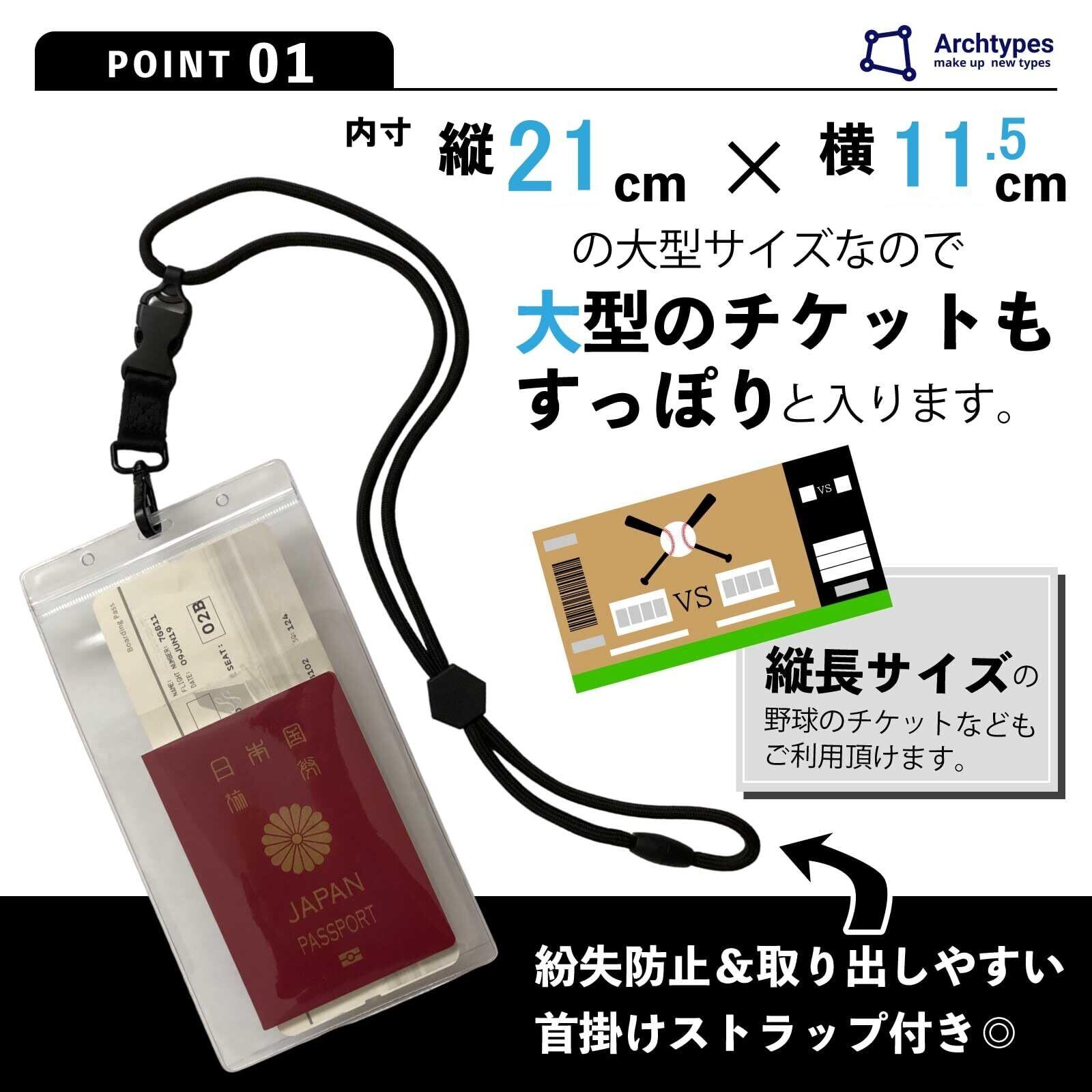 [Archtypes] チケットホルダー 首掛け パスポート ケース 首下げ 防水 透明 軽量 航空券 パスケース パスポートホルダー パスホルダー (1, ブラック)