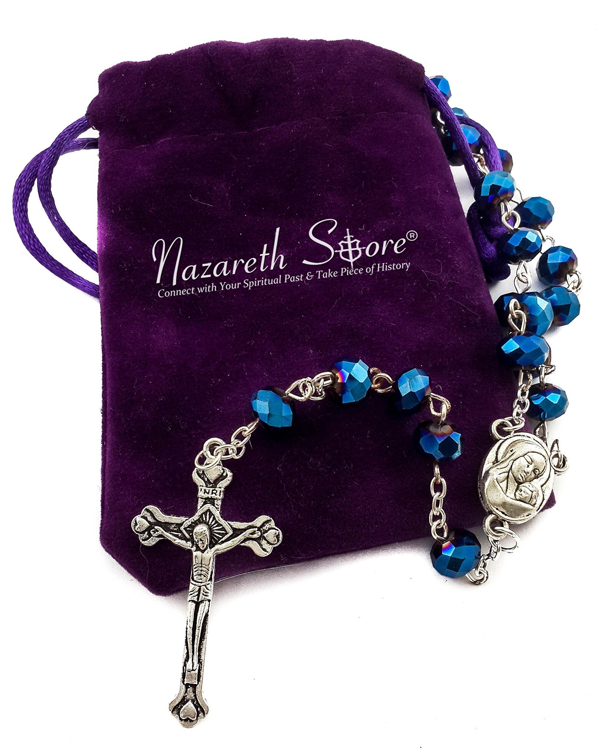 Nazareth Store ディープブルークリスタルビーズロザリオカトリックネックレス聖なる土メダル&磔刑