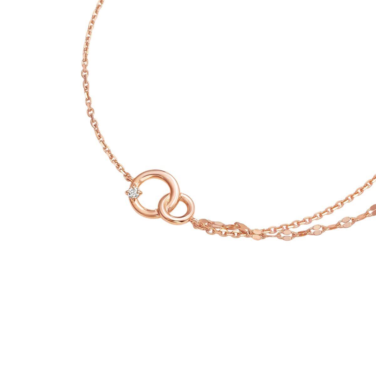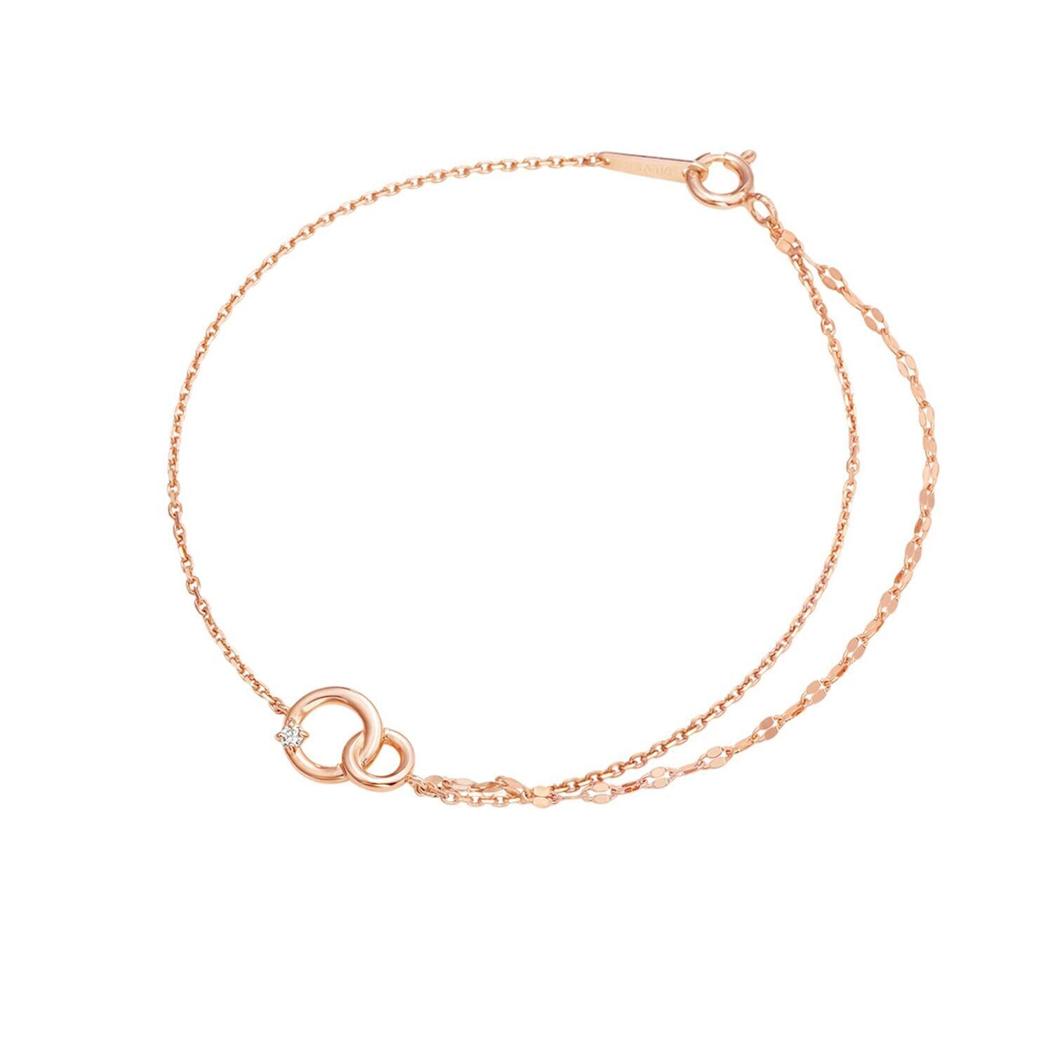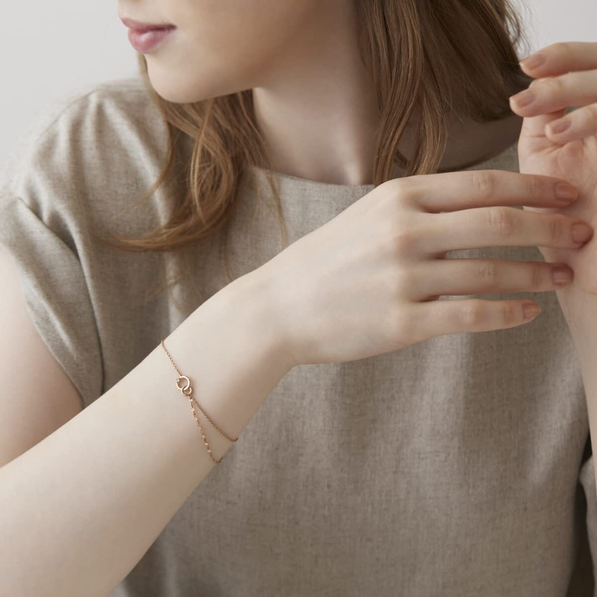2つの輪を重ね合わせたブレスレット。アシンメトリーに添えたチェーンの輝きが、手元を華やかに彩ります。繋がりを意味するダブルループモチーフは大切な方へのギフトにもおすすめです。