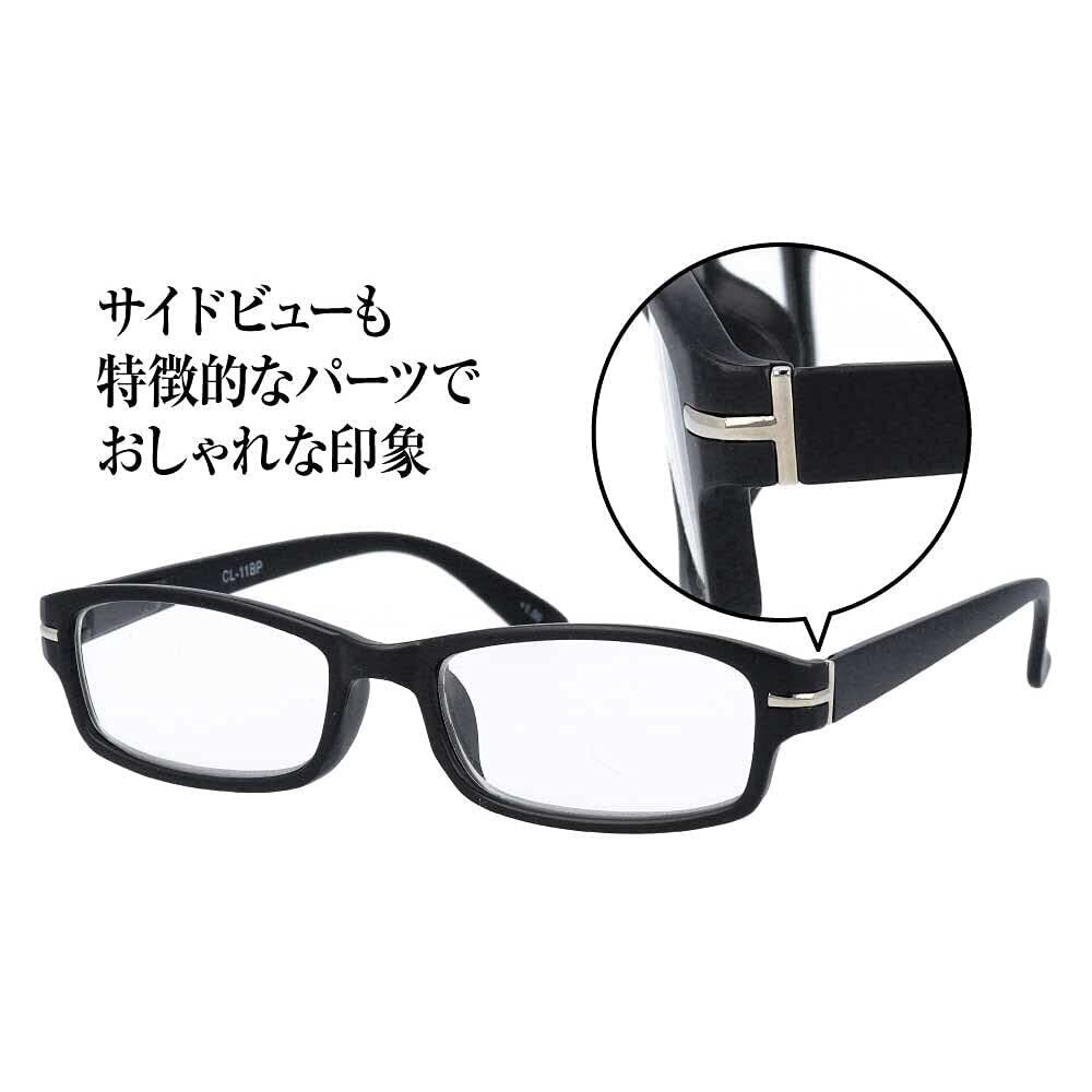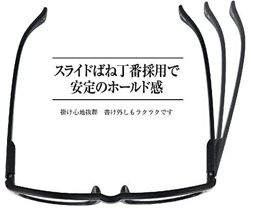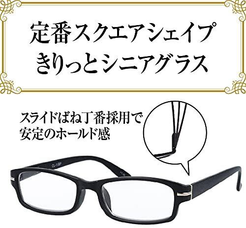 【おしゃれなデザイン】誰にでも似合いやすい定番のスクエアタイプのリーディンググラス。ベーシックなデザインなので、カジュアル・フォーマルのどちらのシーンでも掛けていただけます。艶消しブラックが、大人の落ち着いた印象と高級感を演出。さらに、キリっと表情を引き締める効果も。サイドの「T字飾り」がシンプルなデザインに程よいアクセントを与え、色気のある横顔を演出。老眼鏡には見えないスタイリッシュなデザインで、若々しい印象。
