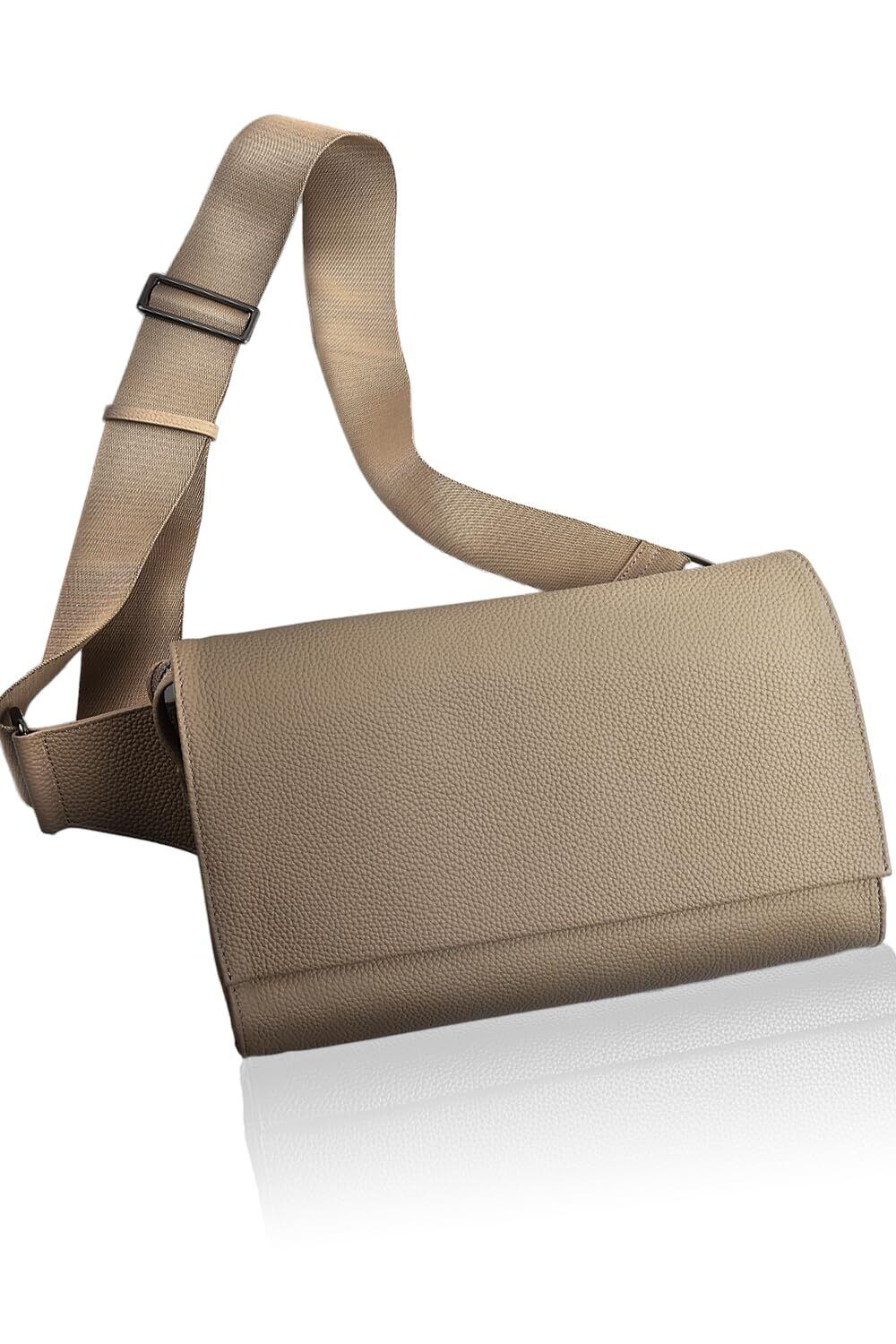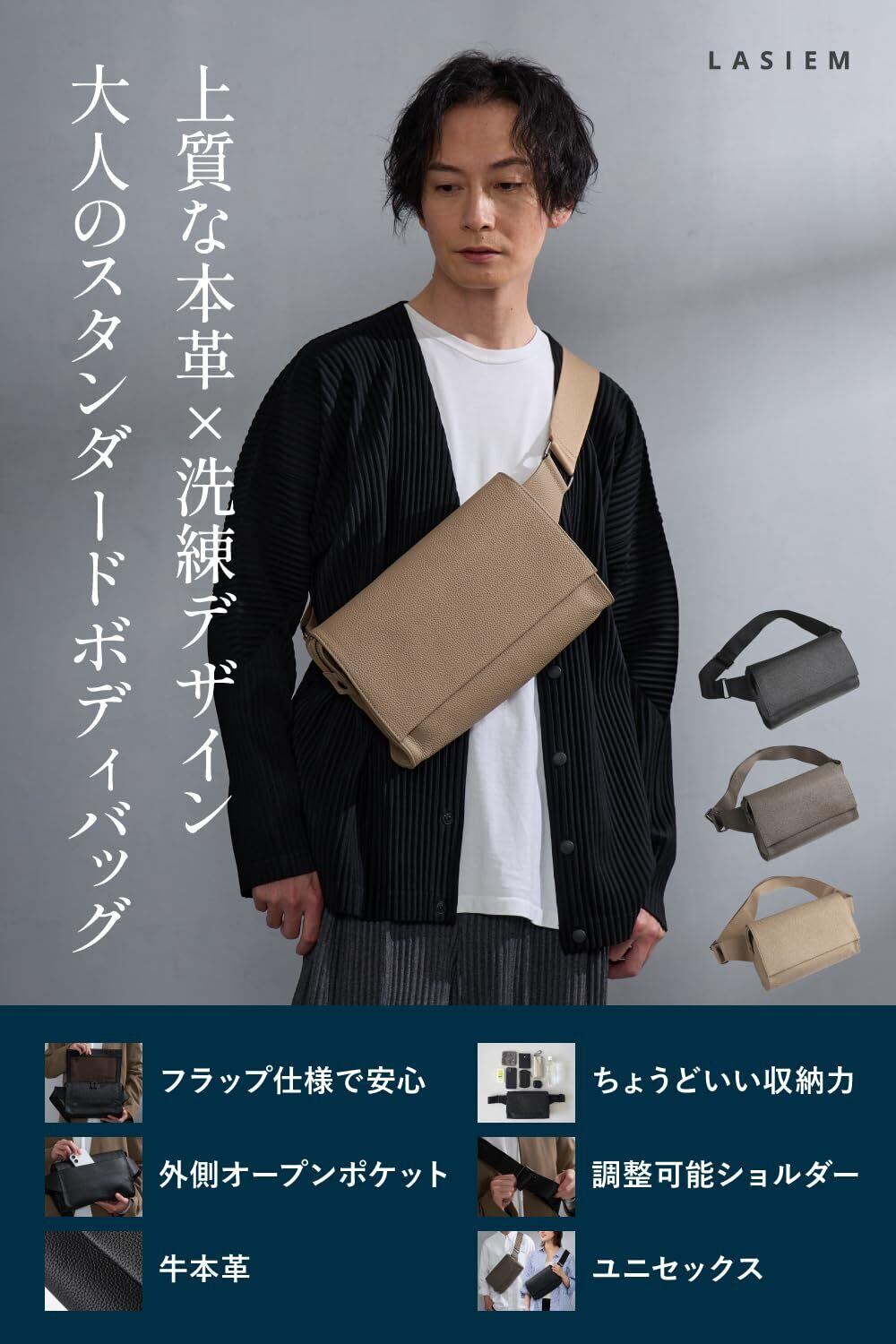 【上質な本革×洗練デザイン】LASIEMから大人のスタンダードボディバッグが登場! ・フラップ仕様で安心 ・ちょうどいい収納力 ・外側オープンポケット ・調整可能ショルダー ・牛本革 ・ユニセックス 長く愛用できるタイムレスなデザインを追求