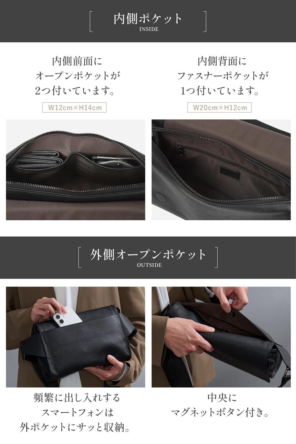 【フラップバッグ】フラップで収納部分をカバーすることでスタイリッシュな印象に。防犯面の安心感もプラス。フラップは内蔵された2か所のマグネットボタンで、ワンタッチで留められる仕様です。 【牛本革】耐久性に優れた牛本革を採用。シボの風合いとマットな質感が大人の上品さを演出。